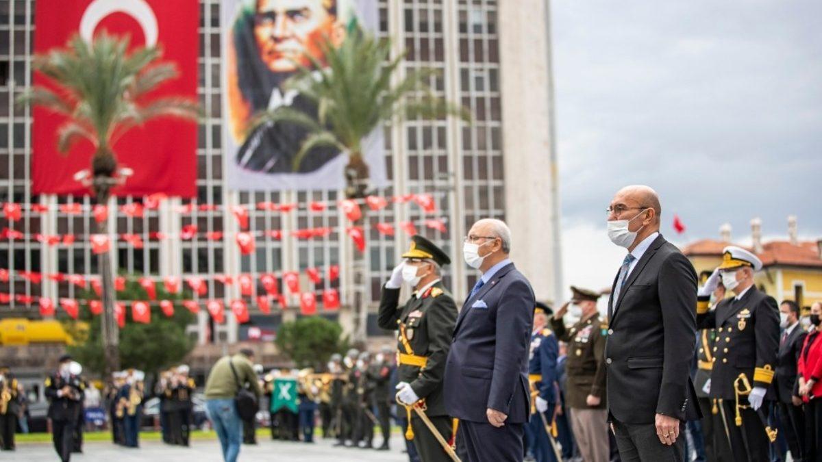 İzmir’de Cumhuriyet Bayramının 97. yıl dönümü kutlamaları, Cumhuriyet Meydanı’nda düzenlenen çelenk töreniyle başladı.