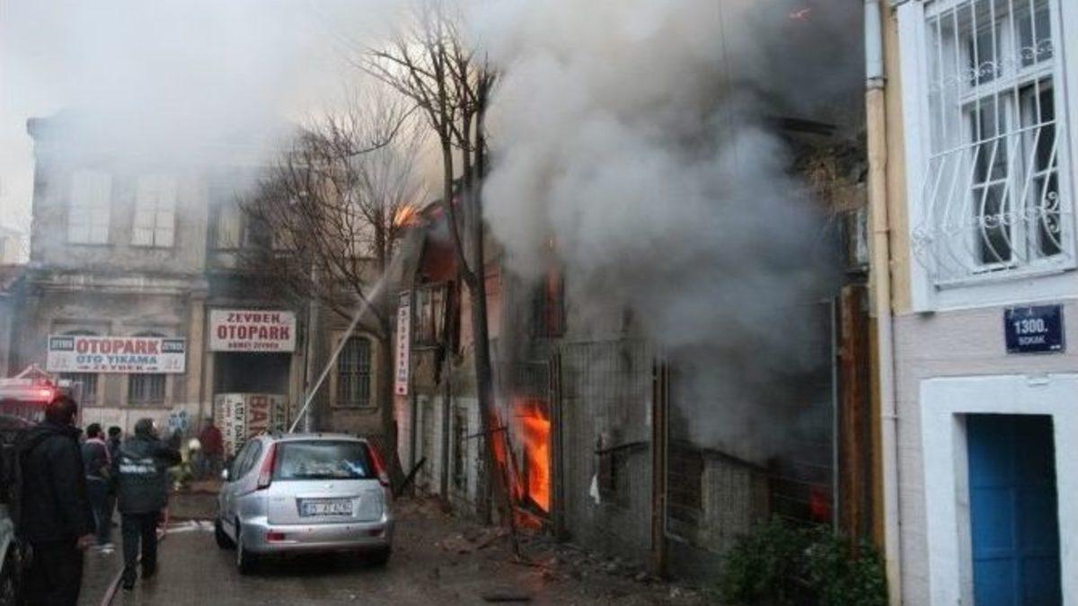 İzmir’in Basmane semtinde bulunan kullanılmayan ahşap bina cayır cayır yandı. Alevlerin etkisiyle çöken bina, çevredekilere korku dolu dakikalar yaşattı.İzmir’in Basmane semtinde bulunan ahşap binada henüz belirlenemeyen bir sebepten yangın çıktı. Oteller bölgesinde 1300 sokak 10 numarada bulunan ahşap metruk bina, rüzgarın da etkisiyle alev alev yandı. Yangının kendi otellerine sıçramasından endişe eden otel sahipleri ise gerekli önlemleri almadıkları gerekçesiyle suçladıkları belediyeye ateş püskürdü. Yanan binanın ahşap olması nedeniyle müdahale sırasında binada yer yer çökmeler oldu. Sokakların dar olması nedeniyle itfaiye ekipleri yangına müdahale etmekte zorlanırken, ateş topuna dönen binanın önünde park edilmiş araçlar da olası bir faciaya davetiye çıkardı.Yanan ahşap binanın yanında bulunan otelin penceresinden sarkan vatandaşlar da hortumla su sıkarak yangını söndürmeye çalıştı. İtfaiye erlerinin yaklaşık 1 saatlik müdahalesi sonucu kontrol altına alınan yangında, metruk binada kimsenin olmaması teselli oldu.