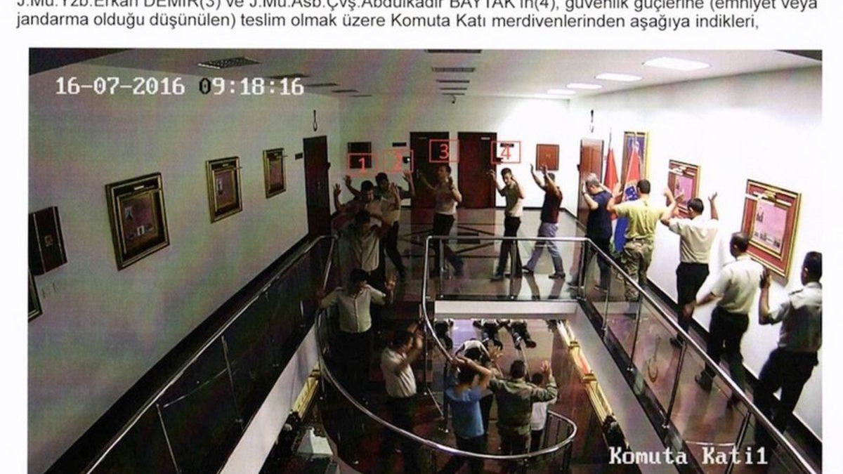 FETÖ’nün 15 Temmuz 2016’daki darbe girişimi sırasında Jandarma Genel Komutanlığında darbeye yönelik faaliyetlerde bulundukları belirlenen cuntacıların gözaltına alınma anlarının fotoğrafları ortaya çıktı.FETÖ’nün darbe girişimi sırasında Jandarma Genel Komutanlığının Beştepe Karargahındaki eylemlere ilişkin 244 sanık hakkında açılan davanın dosyasına, o gece kayıtta olan güvenlik kameralarına ait görüntülerin incelendiği bilirkişi raporu girdi. Raporda, Karargahtaki eylemlerin saat 21.00 sıralarında başladığı ifade edilirken, raporda yer alan fotoğraflarda, hain girişimin bastırılmasının ardından özel harekat polislerinin Karargaha giriş yaptığı görülüyor. Elleri havada gözaltına alınan darbeciler, ifadeleri alınmak üzere emniyete götürülüyor. Güvenlik kameralarınca elde edilen bir fotoğrafta ise bir darbecinin B3 Otopark bölgesindeki havalandırmaya cep telefonunu gizlediği anlar yer alıyor.