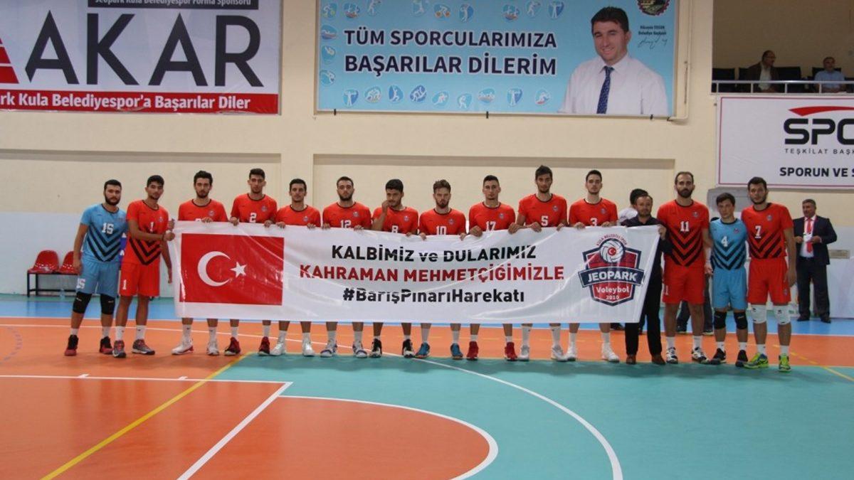 Jeopark Kula Belediyespor’un teknik ekibi ve oyuncuları, Fırat’ın doğusuna yuvalanmış terör örgütlerini temizleyerek güvenli bölge oluşturmak amacıyla başlatılan Barış Pınarı Harekatına destek vermek için, salona “Kalbimiz ve dualarımız kahraman Mehmetçiğimizle #BarışPınarıHarekatı” yazılı pankartla çıktı. Jeopark Kula Belediyespor’un bu hareketi, seyirciler tarafından uzun süre ayakta alkışlandı.