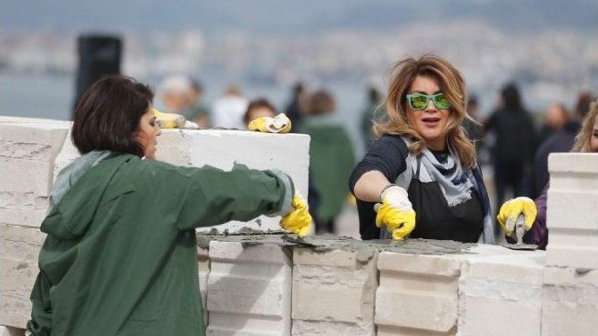 İzmir’de, Konak Belediyesi’nin projesi kapsamında sarı iş eldivenlerini giyen kadınlar, beton blokları taşıyıp harç sürerek şiddete, cinayete, tecavüze, istismara karşı farkındalık oluşturmak için sembolik olarak duvar ördü.İzmir’de, Alsancak Vapur İskelesi önünde toplanan kadınlar, sarı iş eldivenlerini giyip gaz beton bloklarını üst üste koydu, harçları elleriyle karıp, malalarla tuğlalara sürerek duvar ördü. Kadına şiddete karşı dikkat çekmek için yapılan ve yukarıdan bakıldığında kadın siluetini andıran duvarın yapımına farklı meslek gruplarından çok sayıda kadın katıldı. Bazı kadınlar, tuğlaları çocuklarıyla birlikte taşıyarak duvarı ördü. Duvarda 2008-2015 yılları arasında cinayete kurban giden kadınların adları, soyadları ve hangi tarihte kim tarafından nasıl öldürüldükleri yazılacak. Bunun için bin 169 plaka hazırlandı. Ancak duvar bitmeden bu sayı 170’e çıktı. 60 santim eninde, 1.5 metre yüksekliğinde, 53 metre uzunluğundaki duvara tuğla koyan İzmir Büyükşehir Belediye Başkanı Aziz Kocaoğlu, "Kadına yönelik şiddetin azalması yine kadının elinde. Erkek çocuklarını iyi yetiştirin" dedi.’Geleceğini ör’ projesini hayata geçiren Konak Belediye Başkanı Sema Pekdaş da, bu projeyi cinayete kurban giden Özgecan Aslan’ın ölümünün ardından oluşturduklarını belirterek, "Kadınlar taciz ediliyor, tecavüz ediliyor, vahşice öldürülüyor ve her türlü ayrımcılığa maruz bırakılıyor. Biz bir duruş gösteriyoruz. Erkek egemen sistemin kadın cinayetleri, kadın tahakkümü ile ördüğü duvara karşı duruş gösteriyoruz" dedi. Geleceklerini örmek için bugün sembolik anlamda duvar ördüklerini anlatan Pekdaş, "Bu duvar şiddete karşı tepkiyi ortaya koyacak. 2008 yılından bu yana kaybettiğimiz kız kardeşlerimizin, kadınlarımızın isimlerini bu duvara yazacağız. Duvarı sabah örmeye başladık, cinayete kurban giden bin 169 kadının adını plaka olarak hazırladık. Duvar bitmeden sayı bin 170’e çıktı. Kadın erkek eşitliği sağlanıncaya kadar adaletsiz düzen bitinceye kadar, kadınların özgürce sokaklarda dolaştığı, işlerini, eşlerini özgürce seçtikleri günler gelinceye kadar tepkimizi ortaya koyuyoruz. Gelecek bizim" diye konuştu.İzmirli kadınlar, 8 Mart Dünya Kadınlar Günü nedeniyle hazırlanan anı panosuna da ’Kadına şiddete hayır diyoruz’, ’Kadınları küçük görmeye devam edin siz’, ’Kadın sustu, sinsi dediler, kadın güldü hafif dediler. Kadın konuştu, geveze dediler. Kadın giyindi, kadın tahrik etti dediler’ gibi çeşitli mesajlar yazıldı.