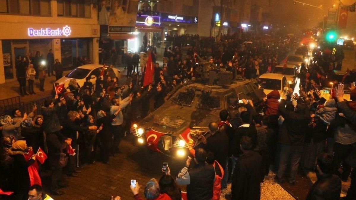 Kahramanmaraş’ta, Zeytin Dalı Operasyonu için sınır hattına giden askeri konvoya vatandaşlar, Pazarcık ilçe merkezinde uğurlama töreni düzenledi.Operasyona katılmak üzere sınırın sıfır noktasına giden askeri konvoya, ilçe merkezi geçişi sırasında moral vermek vatandaşlar, ellerinde Türk Bayraklarıyla Mehmetçiğe destek oldu.Zırhlı araçlarda bulunan askere baklava ikram eden vatandaşlar, ‘Şehitler ölmez vatan bölünmez’ sloganlarıyla dönüş yolunu beklediklerini söylediler.Pazarcık Belediyesi ise, Mehmetçiğe destek olmak adına belediye hoparlörlerinden Mehter Marşı çaldı. Toplu duanın yapılmasının ardından vatandaşlar, kent meydanından ayrıldılar.