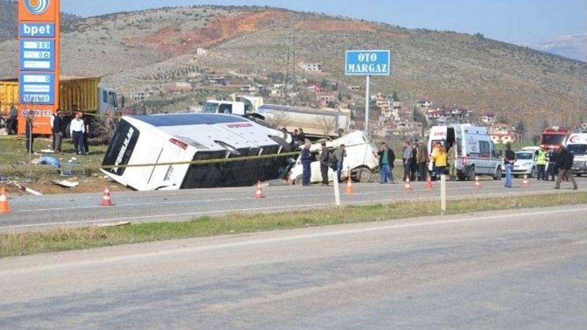 Kahramanmaraş’ın Türkoğlu ilçesinde yolcu otobüsü ile minibüsün çarpışması sonucu meydana gelen kazada, ilk belirlemelere göre 5’i ağır olmak üzere 20 kişi yaralandı.Alınan bilgiye göre, sabah saatlerinde Kahramanmaraş’ın Türkoğlu ilçesi Çakallı mevkiinde Mehmet Eken’in kullandığı 46 D 5310 yolcu otobüsü ile aniden yola çıkan Mehmet Solmaz yönetimindeki 46 HY 266 plakalı minibüs çarpıştı. Feci kazada minibüs, çarpışmanın etkisiyle bir süre sürüklendikten sonra yola savrularak devrildi. Otobüste ise ilk belirlemelere göre 20 kişi yaralandı.Çok sayıda sağlık ekibinin sevk edildiği kaza yerinde, jandarma ve polis ekipleri geniş güvenlik önlemleri aldı. Bir süre trafiğe kapatılan karayolunda, jandarma ekipleri yaralıların özel eşyalarını güvenli bölgeye taşıdı.112 Acil Servis ekipleri tarafından kentteki çeşitli hastanelere kaldırılan yaralılardan bazılarının durumlarının ağır olduğu öğrenildi.Kazanın görgü tanığı vatandaş, "Minibüs karşıdan karşıya geçiyordu. Otobüsü görmedi galiba, otobüs de sürükleyerek buraya kadar getirdi ve sonra kendisi de savruldu" dedi.Ekiplerin kaza yerindeki çalışması halen sürüyor.