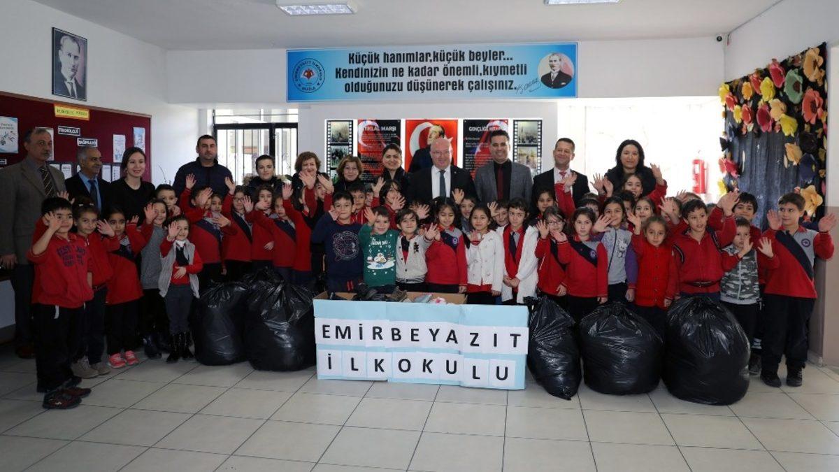Menteşe Emirbeyazıt İlkokulu öğrencileri, Menteşe Belediyesi’nin sosyal sorumluluk projelerinden ‘Ele ele butik’ için topladıkları yardım kolilerini Menteşe Belediye Başkanı Bahattin Gümüş’e teslim ettiler.