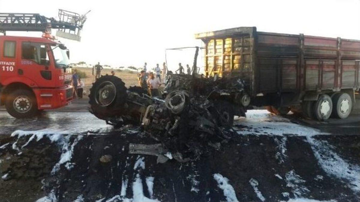 Şanlıurfa’da kamyon ile tarım işçilerini taşıyan traktörün çarpışması sonucu ilk belirlemelere göre 1 kişi hayatını kaybederken, çoğu kadın en az 20 kişinin yaralandığı öğrenildi.Edinilen bilgiye göre kaza, akşam saatlerinde Birecik-Şanlıurfa karayolunun Birecik ilçesi girişinde bulunan araç muayene istasyonunun önünde meydana geldi. Şanlıurfa istikametinden Birecik ilçesine gitmekte olan kamyon, aynı yöne gitmekte olan ve fıstık toplamaktan dönen tarım işçilerini taşıyan traktöre arkadan çarptı. Kamyonun şoför kabini ile traktör çarpışmanın etkisiyle alev aldı. Yangın, itfaiyenin müdahalesi sonucu söndürüldü. Kazada ilk belirlemelere göre Ahmet Demir hayatını kaybederken, çoğu kadın en az 20 kişinin ise yaralandığı öğrenildi. Yaralılar olay yerine sevk edilen çok sayıda ambulansla Birecik Devlet Hastanesi’ne kaldırıldı. Yaralılardan bazılarının sağlık durumunun ağır olduğu öğrenildi.Kaza nedeniyle Şanlıurfa-Birecik karayolu uzun süre trafiğe kapandı. Kazayla ilgili soruşturma başlatıldı.