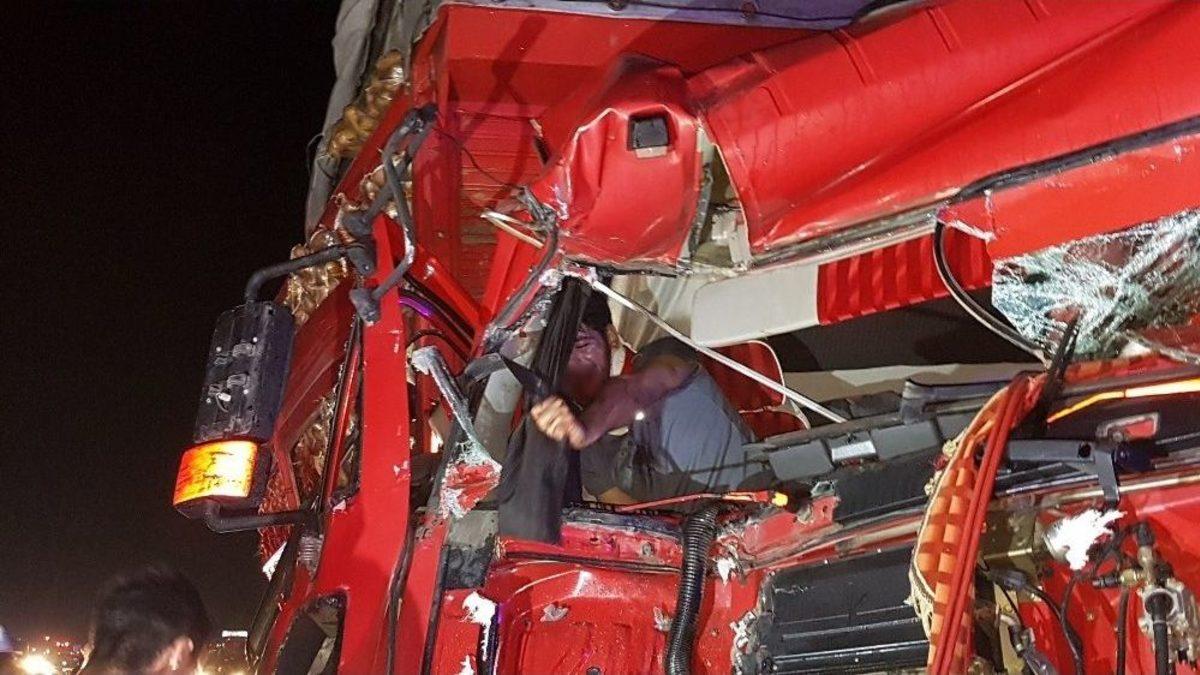 Antalya’nın Manavgat ilçesinde kamyonun tıra arkadan çarpması sonucu yaşanan kazada 2 kişi yaralandı. Kazadan sonra kamyonda sıkışan genç ise kurtarma ekiplerinin 2 saat süren çalışmasının ardından araçtan çıkarılabildi.Edinilen bilgiye göre, Alanya-Manavgat D-400 karayolunda İbrahim Deniz idaresindeki 33 YD 484 plaka 33 YK 604 dorse plakalı tıra, Veysel Başak’ın kullandığı 07 BLG 77 plakalı patates yüklü kamyon arkadan çarptı. Tıra arkadan çarpan ve ön kısmı hurdaya dönen kamyonun sürücüsü Veysel Başak kazayı hafif yaralı olarak atlatırken, yanında bulunan kardeşi Okan Başak ise araç içerisinde sıkıştı.Antalya Büyükşehir Belediyesi’ne ait 3 ayrı kurtarıcı olay yerine gelerek talihsiz genci sıkıştığı yerden çıkarmaya çalışırken, İYAK İnsani Yardım ve Kurtarma ekibi de kurtarma çalışmasına destek verdi. Kamyonun ön sağ bölümünün büyük çapta zarar görmesi ve gencin ayağına saplanan demir, kurtarma ekibinin zorlanmasına neden oldu. Yaklaşık 2 saatlik çalışmanın ardından Okan Başak isimli genç sıkıştığı yerden kurtarılırken 2 kardeş ambulans ile Manavgat Devlet Hastanesine kaldırıldı.Olay yerinde güvenlik güçlerine kazayı anlatan kamyon şoförü Veysel Başak, yanında bulunan kardeşi Okan’ın uyumaya başladığını, ona dönerek arkaya geçip yatmasını söylediğini, aynı anda telefonla görüşme yaptığını ve bir anlık dalgınlık sonucu öndeki seyir halindeki tıra çarptığını söyledi. Kazanın ardından kamyonun çarptığı tır sürücüsü İbrahim Deniz, jandarma tarafından gözlem altına alındı.