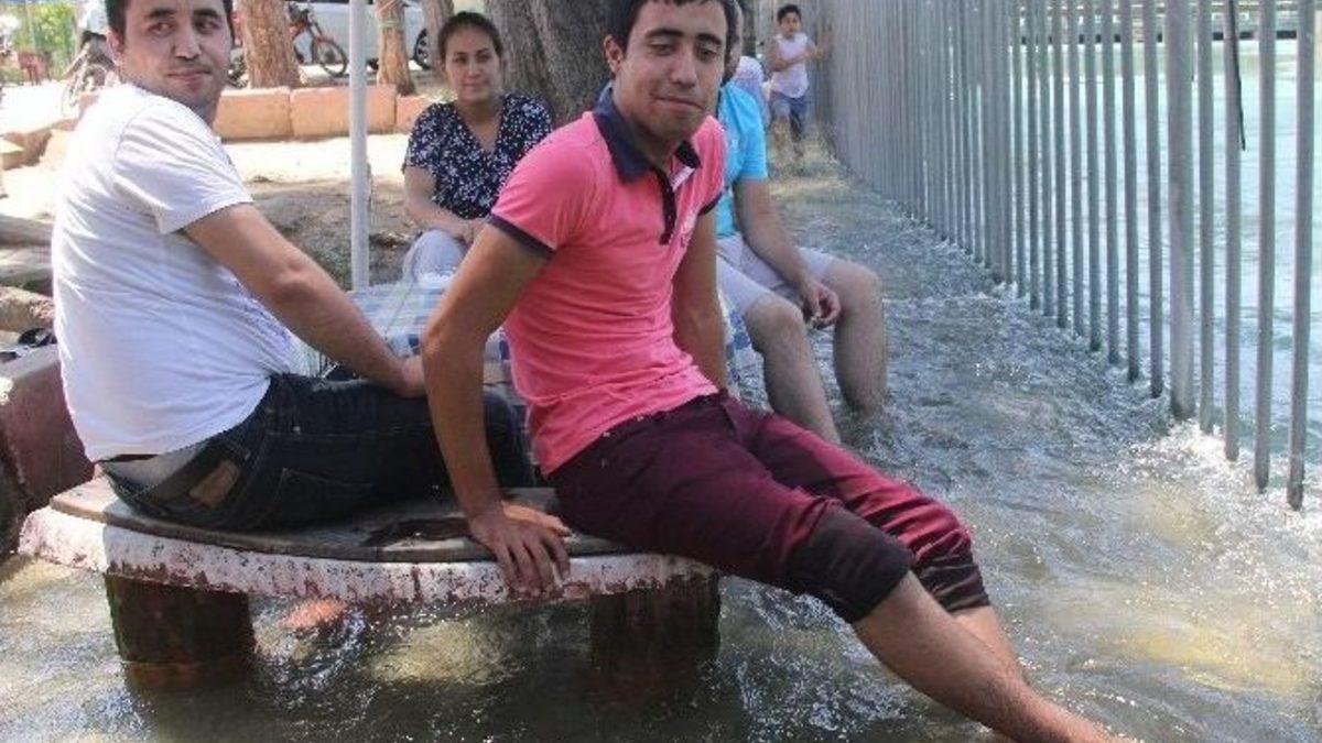 Termometrelerin 45 dereceyi gösterdiği Adana’da vatandaşlar, sulama kanalından taşan sulara ayaklarını sokarak serinliyor.Türkiye genelinde mevsim normallerinde giden sıcak hava bir haftadır hissedilir derecede arttı. Sıcak havayla birlikte nemin yükselmesi bunaltıcı bir havanın ortaya çıkmasına neden oldu. Termometreler ise 45 dereceyi gösterirken nem ile birlikte hissedilen sıcaklık daha da artıyor. Adana’nın bu kavurucu ve bunaltıcı sıcağında yaylaya ya da denize gidemeyen Adanalılar serinlemek için birbirinden ilginç yöntemler buluyor. Bu yöntemlerden biri de Yüreğir ilçesine bağlı Kışla Mahallesi’nden geçen DSİ’ye ait sulama kenarındaki belediyenin yaptığı bank ve masaların altından geçen sular oldu. DSİ’nin sulama kanalına verdiği su kanaldan taşarak bank ve masaların altına kadar yükseldi. Sıcaktan bunalan vatandaşlar da bunu fırsat bilerek burada ayakkabı ve çoraplarını çıkartarak banka oturup serinlemeye çalışıyor. Kanal kenarındaki masalar ve banklar hiç boş kalmıyor. Vatandaşlar bir an önce banka oturup ayağını suya sokmak için diğer vatandaşın gitmesini gözlüyor.Çocuklar ise burada boğulma tehlikesi olmadan suya girmenin keyfini yaşıyor. Bazı vatandaşlar ise banka oturmak yerine suya oturarak serinleme yöntemini seçiyor. Vatandaşların bu yöntemle serinlemeye çalışması ilginç görüntüler oluşturuyor. Vatandaşlar, "Adana’da havalar çok sıcak, evde bunalıyoruz. Bu nedenle kanal kenarına gelip ayağımızı suya sokarak serinlemeye çalışıyoruz. Su buz gibi gerçekten serinliyoruz" dedi.