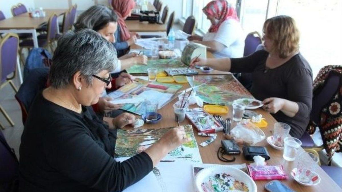 Tekirdağ’da kanser hastası kadınlar, Tekirdağ Halk Sağlığı Müdürlüğü’nde yaptıkları resim atölye çalışmalarında hayallerini resme dökerek kansere karşı çıkıyor.Tekirdağ Halk Sağlığı Müdürlüğü ve Tekirdağ Halk Eğitim ve Akşam Sanat Okulu’nun desteğiyle onkoloji bölümünde tedavi gören, tedavisi tamamlanmış ve yakınlarına destek amaçlı gelen kadınlar, gönüllü resim öğretmeninden eğitim alıyor. 2 yıldır yürütülen ve resim çalışması için onkoloji servisleri ve hastaneler dışında hastalara çalışma ortamı hazırlayan Tekirdağ Halk Sağlığı Müdürlüğü, hastaların yaptığı resimleri müdürlük binasının duvarlarında sergiliyor.Kanser hastalarının moralini sanatla yüksek tutmayı amaçlayan projeyi destekleyen Tekirdağ Halk Sağlığı Müdürü Mahmut Akdağ, yapılan resim çalışmalarının kurum duvarlarını süslediğini gören hastaların mutlu olduğunu ve kanser tedavisinde moralin çok önemli olduğunu belirtti.Kanser hastalarının Türkiye genelinde ilk ve tek olarak Tekirdağ Halk Sağlığı Müdürlüğü bünyesinde resim atölye çalışması yapabilme olanağı bulduğunu belirten Tekirdağ Halk Sağlığı Müdürü Mahmut Akdağ, yapılan çalışmaların hastaların birbiriyle aynı duyguları yaşayan kişilerin kaynaşması açısından verimli olduğunu dile getirerek, "İlimizde KETEM’de meme kanseri tanısı konmuş veya diğer kanser türlerinden erken tanısı konmuş onkoloji servisinde tedavi gören ve ameliyatını başarıyla olmuş kontrolü devam eden hastalarımızla resim kursu yürütüyoruz. Tekirdağ Halk Eğitim Merkezi’nden bize bir resim öğretmenimiz gönüllü olarak destek verdi. Her hafta düzenlediğimiz resim atölye aktivitesiyle gönüllü resim öğretmenimiz hiç hayatında resim yapmamış, kansere erken yakalanmış kanser tedavisi gören kadınlarımızı bu kurslara davet ettik. Hastalarımızın yanı sıra onlara destek vermek için gelen yakınları da resim çalışmasıyla morallerini yüksek tutarak birbirlerine destek oluyor. Kendi dertleri ve başkalarının dertlerini resim çalışmalarıyla paylaşan hastalarımız böylelikle bir tür motivasyon arttırıcı terapi yapmış oluyor. Bu resim çalışmalarını biz onkoloji merkezinde veya hastanede değil Halk Sağlığı Müdürlüğü’müzde yapıyoruz. Onların yaptıkları resimleri müdürlüğümüzün ve onkoloji servisinin duvarlarına asarak sergiliyoruz. Bu çalışmayı yürüten Halk Sağlığı Müdürlüğü ve Toplum Sağlığı Merkezi’nde yapan tek iliz" dedi.Resim atölyesinde kanser hastalarına gönüllü olarak eğitim veren resim öğretmeni Cana Karabulutlar hastalara ve yakınlara verdikleri eğitimle hayallerini resme dökmelerini sağladıklarını, hastaların böylelikle resme döktükleri duygularıyla aynı dertten mustarip kişilerin kaynaşmasını sağladığını belirtti.Resim atölyesinde çalışma yapan meme kanseri Aygül Uzel, resimle hayatına renk kattığını, hastalığa karşı atölyedekilerle birlikte resim çizerek karşı koyduklarını, mutluluklarını ve dertlerini burada paylaştıklarını ifade etti.