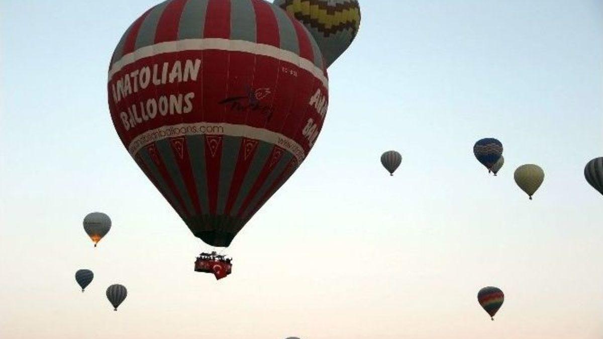 Türkiye’nin önemli turizm merkezlerinden Kapadokya’da, Cumhuriyetin kuruluşunun 93. yıl dönümü nedeniyle çok sayıda balon bu sabahki uçuşlarında sepetlerine Türk bayrağı astı.Peribacaları ile ünlü Kapadokya bölgesinde, yerli ve yabancı turistlerin büyük ilgi gösterdiği sıcak hava balonları, güneşin ilk ışıklarında 29 Ekim Cumhuriyet Bayramı dolayısıyla sepetlerine Türk bayrağı asarak havalandı. Türk bayrakları peribacaları arasında dalgalanırken yüzlerce balonun Kapadokya semalarındaki görüntüsü eşsiz bir manzara oluşturdu. İçerisinde Uzakdoğulu ve Avrupalı turistlerin bulunduğu balonların uçuşu yaklaşık 1 saat sürdü.Anatolian Balloons Pilotu Eray Bora, her yıl geleneksel olarak 29 Ekim Cumhuriyet Bayramı’nda balonların sepetine Türk Bayrakları asarak havalandıklarını belirterek, "Her sene olduğu gibi bu sene de Cumhuriyet Bayramımızı binlerce fit yüksekte kutlayacağız. Cumhuriyetimizin 93.yaşı kutlu olsun” dedi.Kapadokya bölgesinde yüzlerce balon Türk bayrakları ile havalanırken bu eşsiz manzarayı fotoğraflamak isteyen turistler ise bol bol hatıra fotoğrafı çekinmesi dikkatlerden kaçmadı.