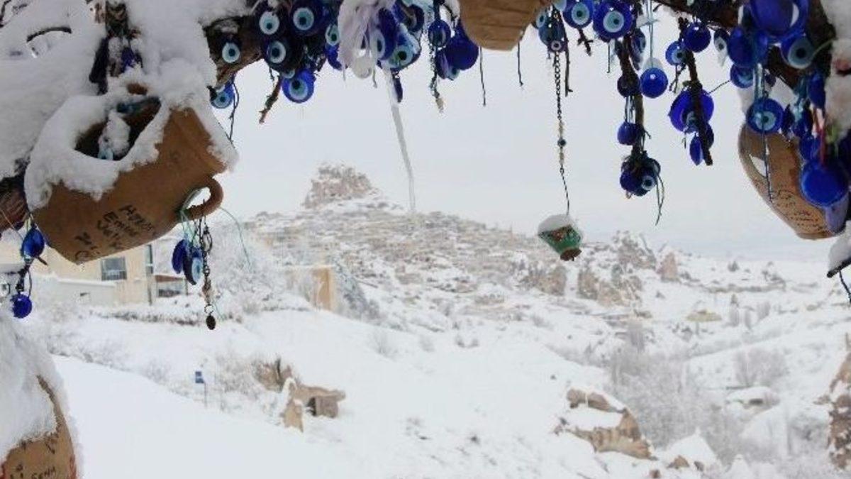 Türkiye’nin en önemli turizm merkezlerinden bir tanesi olan Kapadokya’da kar yağışının ardından muhteşem manzaralar ortaya çıktı.Kapadokya bölgesine dün akşam saatlerinden itibaren yağan kar yağışının ardından karlar altında kalan peribacaları büyüledi. Yerli ve yabancı turistler özellikle Uçhisar Güvercinlik Vadisi, Uçhisar Kalesi ve Göreme’de bol bol hatıra fotoğrafı çekinirken, peribacalarının eşsiz manzarası karşısında adeta büyülendiler.Bölgeyi Eskişehir’den gezmek için gelen Mustafa Kaan Kurt, ”Kapadokya bölgesine dün geldik. Geldiğimiz gün kar yoktu. Sabah uyandığımızda kar ile birlikte uyandık. Çok güzeldi. Şimdi de bölgeyi geziyoruz. Harika bir manzara var” dedi. Samsun’dan gelen Melis isimli vatandaş ise Kapadokya bölgesine ilk kez geldiğini ve karlar altında şaşırtıcı bir güzellikle karşılaştığı için son derece mutlu olduğunu söyledi.