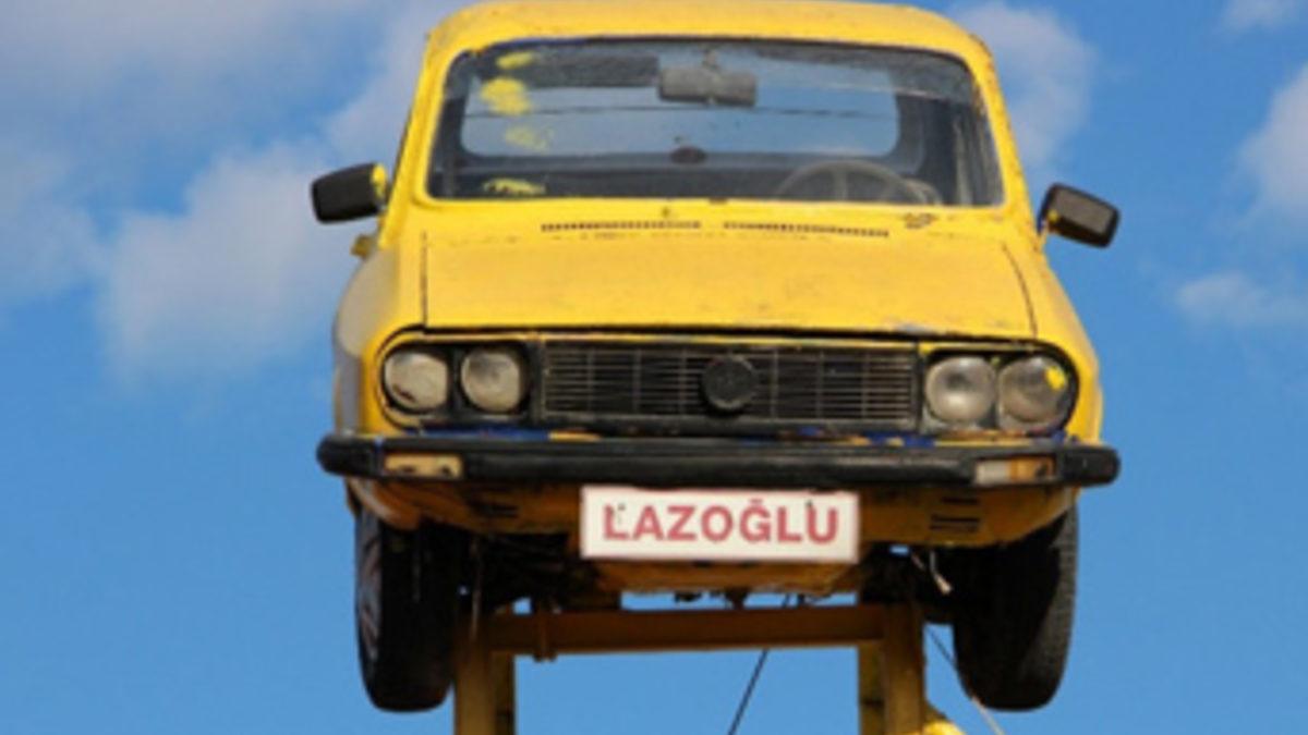 Karadenizli bir kaportacının iş yerinin çatısını koyduğu eski otomobil, uzaktan bakınca ''uçan araba'' sanılıyor.
