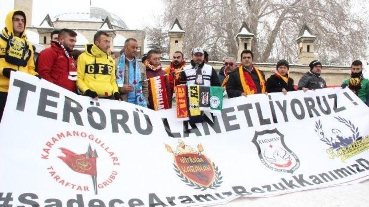 Karaman’da taraftar gruplarınca düzenlenen "Teröre Lanet" yürüyüşünde, İstanbul Beşiktaş ve Kayseri’deki terör saldırıları protesto edildi.Aktekke 15 Temmuz Demokrasi Meydanı’nda toplanan takım taraftarları ve vatandaşlar, "Şehitler Ölmez Vatan Bölünmez", "Kahrolsun PKK", "Askere Uzanan Eller Kırılsın" sloganları attı. Grup adına konuşan Karaman Beşiktaşlılar Derneği Başkanı Şevket Varol, İstanbul Beşiktaş ve Kayseri’deki terör saldırılarında şehit olanlara Allah’tan rahmet diledi.Bu vatanın masa başında değil, ataların ve şehitlerin kanıyla alındığını ifade eden Varol, "Ülkemizde yaşayan, nefes alan, farklı siyasi görüşlerden, dini inanışlarından, her türlü etnik kökenden ve farklı renklere gönül vermiş milyonlarca insanın tek ortak düşüncesi ülkemizin birliği, beraberliği ve barış içerisinde yaşamasıdır. Bu ortamı zedelemeye çalışan, türlü oyunlar oynayarak halkımız arasında kaos ortamı oluşturmaya uğraşan, kardeşi kardeşi kırdırmak için uğraşan hainleri kınıyoruz. Vatanımızda gözü olanlara biz yine geçit vermeyeceğiz" dedi.Yapılan basın açıklamasının ardından taraftarlar meydanda bulunan polislere karanfil vererek hatıra fotoğrafı çektirdi. Kalabalık daha sonra ellerindeki Türk bayrakları ile Molla Fenari Caddesi güzergahından Kemal Kaynaş Stadyumu önüne kadar slogan atarak yürüdü.