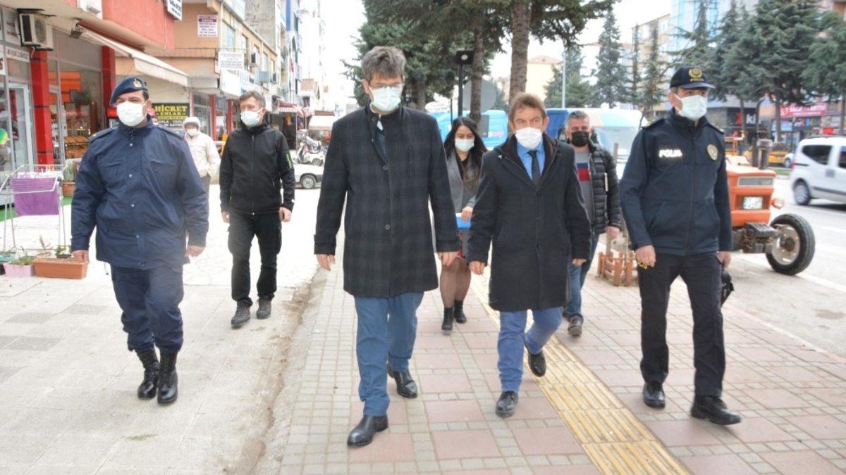 Korona virüs ile mücadele kapsamında, vaka sayısının önüne geçilmesi yönünde ilçe merkezinde yapılan denetimlere katılan kaymakam Civelek, vatandaşlara maske, mesafe ve temizlik konularında vatandaşları iş yerlerinde çalışanların ve müşterilerin ürünlere asgari düzeyde temas etmemeleri ve iş yerlerinde hijyen kurallarına uyulması konularında bilgilendirme yaptı.