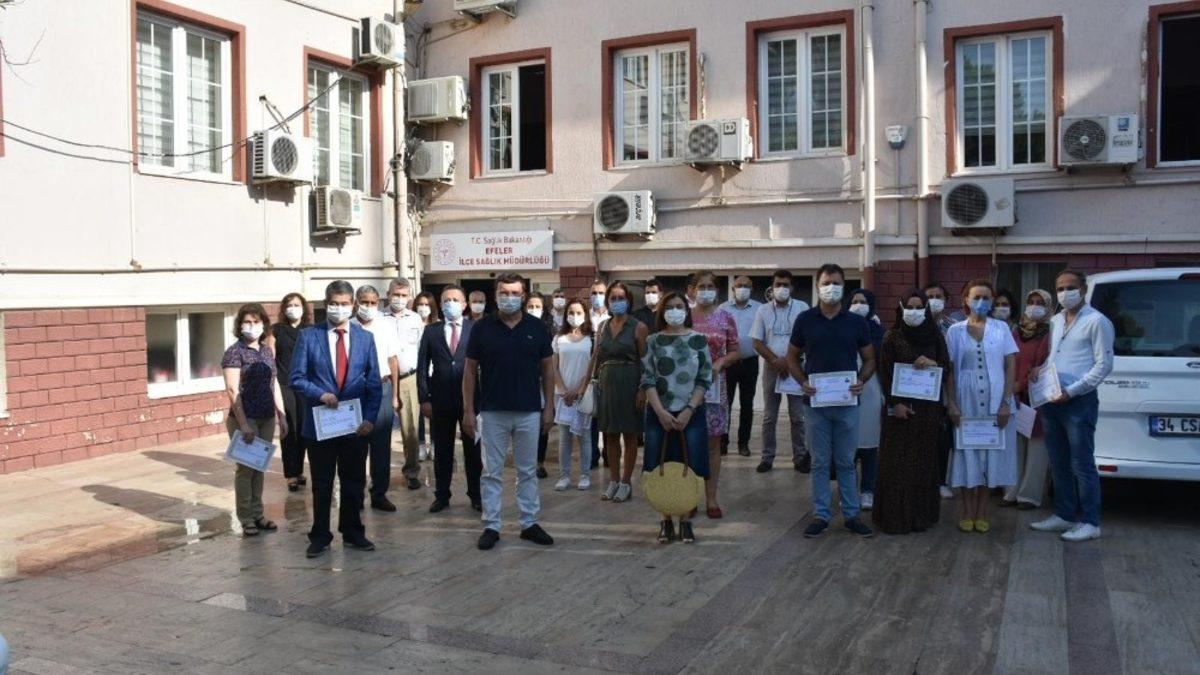 Tüm dünyayı etkisi altına alan ve ülkemizde de görüldüğü günden bugüne 7 binin üzerinde kişinin hayatına mal olan Korona virüs insan sağlığını tehdit etmeye devam ediyor. Korona virüs ile mücadele kapsamında tüm sağlık personeli büyük bir özveri ile çalışırken, Efeler Kaymakamı Cemal Şahin Efeler İlçe Sağlık Müdürlüğü’nü ziyaret ederek filyasyon ekibinde görevli personelleri başarı belgesi ile onurlandırdı.