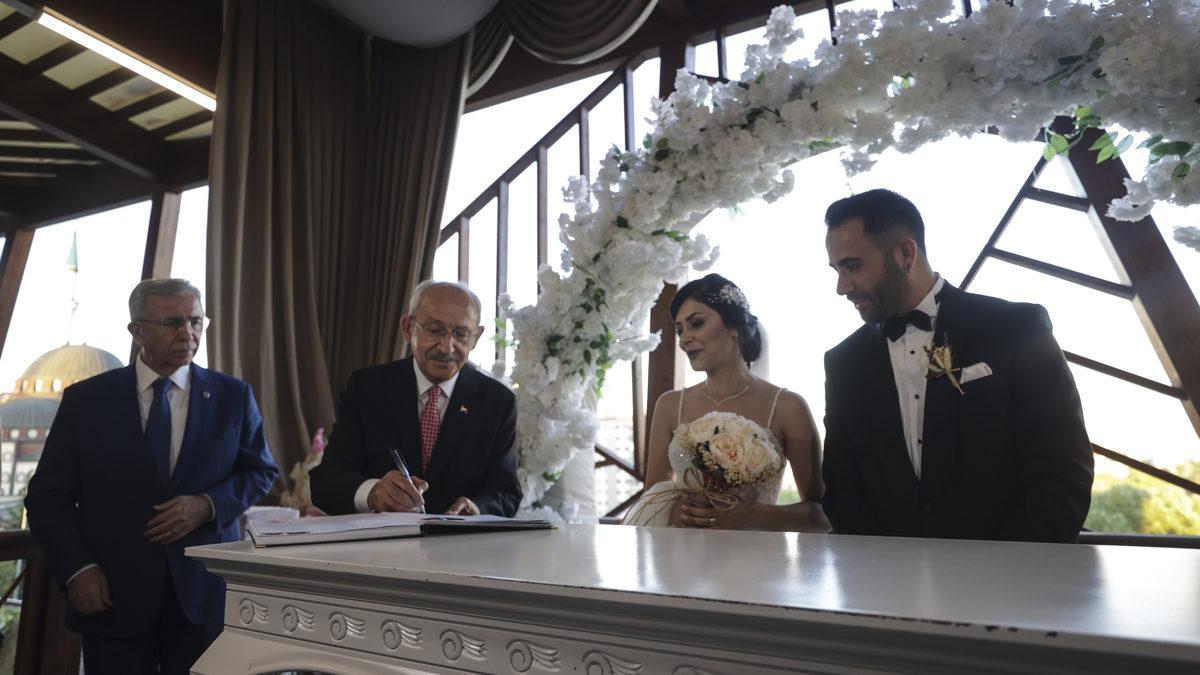 Yenimahalle Belediye Başkanı Fethi Yaşar'ın kıydığı nikahta, çiftin şahitliklerini CHP Genel Başkanı Kılıçdaroğlu ile Ankara Büyükşehir Belediye Başkanı Mansur Yavaş yaptı.