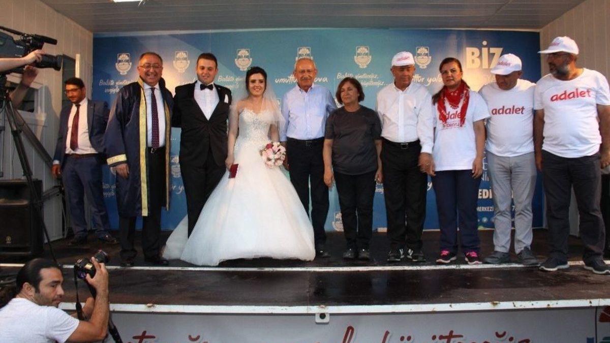 CHP Genel Başkanı Kemal Kılıçdaroğlu, yürüyüşünün 20. gününün sonunda partisinin Kocaeli İl Gençlik Kolları Başkanı Murat Erinç’in nikah töreninde şahitlik yaptı.CHP Genel Başkanı Kemal Kılıçdaroğlu, partisinin İstanbul Milletvekili Enis Berberoğlu’nun tutuklanmasına tepki amacıyla Ankara Güvenpark’tan başlattığı yürüyüşün 20. gününde kamp için mola verilen Kocaeli’nin Körfez ilçesindeki yarımca sanayi bölgesinde CHP Kocaeli İl Gençlik Kolları Başkanı Murat Erinç ile nişanlısı Şeyda Arslan’ın nikah törenine katıldı. Yalova Belediye Başkanı Vefa Salman’ın kıydığı nikahta genç çiftin nikah şahitliklerini Kılıçdaroğlu ve CHP Kocaeli milletvekilleri yaptı.Nikahın ardından Kılıçdaroğlu, “Bu tabloları görmek için yürüyoruz, çocuklarımız, evlatlarımız, torunlarımız güzel günler görsün diye. Her evde huzur, Türkiye’de huzur olsun. Birlikte yaşama irademizi ortaya koyalım diye bu mücadeleyi yapıyoruz. Bu nikaha katıldığım ve tanıklık yaptığım için son derece mutluyum. Kendilerini yürekten kutluyorum” dedi.Kılıçdaroğlu genç çifte Türk bayrağı hediye ederken, nikah cüzdanını geline verdi. Ardından Kılıçdaroğlu çiftinin gelin ve damada takılarını takmasının ardından tören sona erdi.