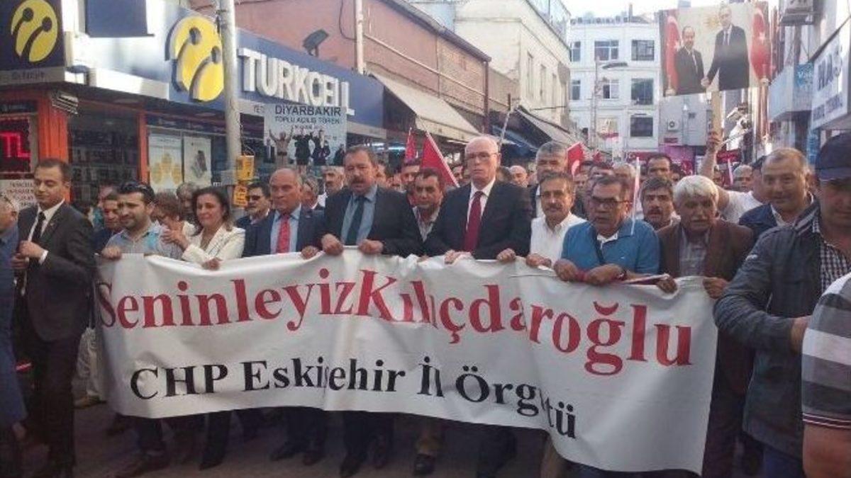 Eskişehir’de CHP Genel Başkanı Kemal Kılıçdaroğlu’na destek yürüyüşünde gerginlik yaşandı.Cumhuriyet Halk Partisi Genel Başkanı Kemal Kılıçdaroğlu’na yapılan saldırıyı protesto etmek için yürümek isteyen grup ile polis arasında arbede yaşandı. CHP’li milletvekilleri ve belediye başkanlarının da olduğu gruba polis ekipleri ilk önce yürüyüş izni vermedi. Bu sırada CHP Eskişehir Milletvekili Cemal Okan Yüksel, "Eğer Türk polisiyseniz bizi yürütürsünüz, eğer AK Parti polisi iseniz bizi engellersiniz" dedi. Tartışmanın ardından Çevik Kuvvet barikatına yüklenildi.Yürüyüş devam ediyor.