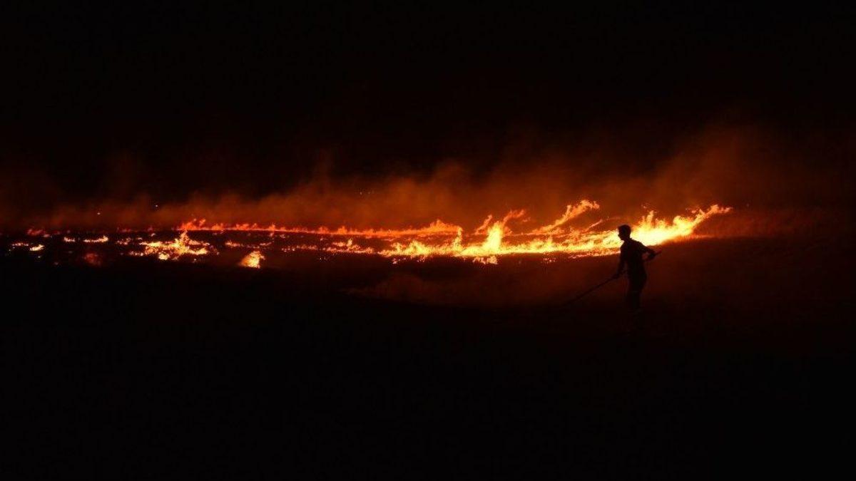 Kırıkkale’de tarım arazisinde çıkan yangın kontrol altına alınmaya çalışılıyor.Edinilen bilgiye göre, Keskin ilçesine bağlı Gülkonak köyünde yaklaşık 12 hektarlık tarım arazisinde yangın çıktı. Rüzgarın etkisiyle alevler, diğer tarım arazilerine sıçradı. Bölgeye sevk edilen Kırıkkale Belediyesi ve Keskin Belediyesi itfaiye ekipleri ile Makine Kimya Endüstri Kurumuna ve Orman İşletme Müdürlüğüne bağlı yangın söndürme ekipleri yangına müdahale ediyor. Trans Anadolu Doğalgaz Boru hattının geçiş istasyonuna kadar ulaşan alevler, Keskin jandarma ekiplerinin uğraşları sonucunda TANAP çevresinde kontrol altına alındı. Yangın söndürme ekipleri, alevlerin Keskin F Tipi Cezaevine ilerlememesi için yoğun çaba harcıyor.