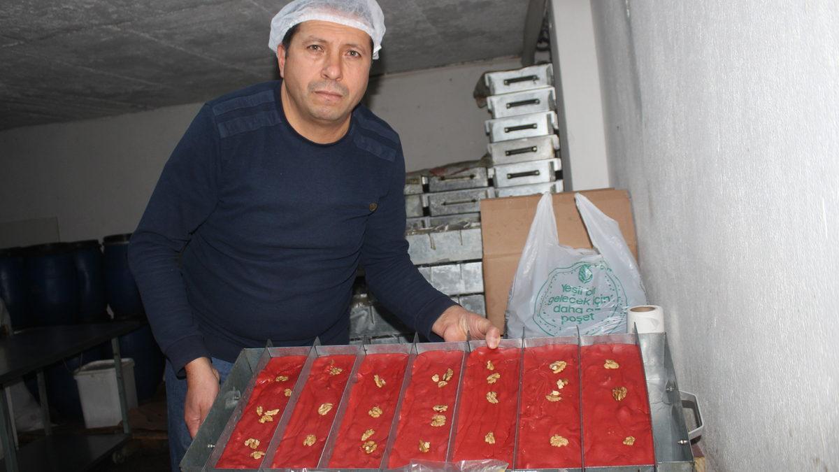 En çok ilgiyi gören ürünün 'tahin helvası' olduğunu söyleyen Ünal, “Helvanın ana maddesi tahin. Tahin de zaten susamdan elde ediliyor. Kalıplarda bir gün bekliyor. Şeker ile tahin bütünleşiyor. Ertesi gün kalıplardan çıkartıyoruz. Tezgahımıza koyuyoruz, müşterilere ikram ediyoruz ve satıyoruz. En çok sade tahin helvası tüketiliyor" diye belirtti.