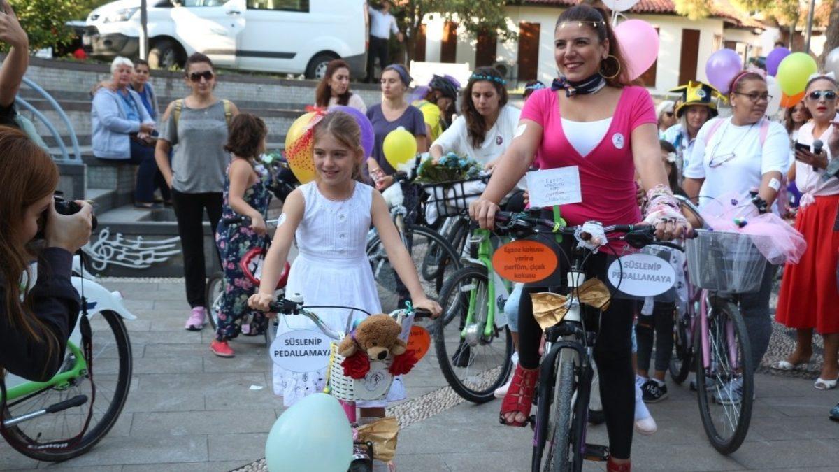 Kocaeli’de bir araya gelen ’Süslü kadınlar’ Dünya Otomobilsiz Kentler Günü’nde egzoz salınımının zararına dikkat çekmek amacı ile kent merkezinde pedal çevirdi.