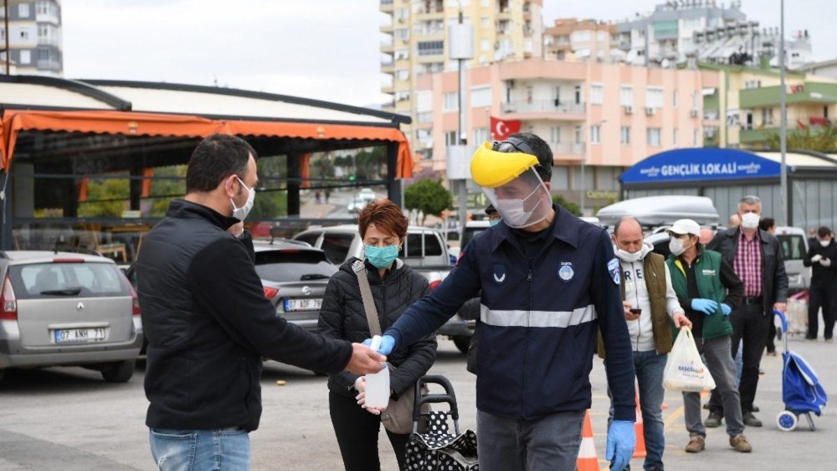 Konyaaltı Belediyesi, korona virüs salgını önlemleri kapsamında semt pazarlarına gelen vatandaşların sosyal mesafe kuralına göre 10 dakika aralıklarla pazar alanına girişi sağlıyor. Belediye ekipleri, pazar yerlerinde maskesi olmayan vatandaşlara ücretsiz maske dağıtıyor.