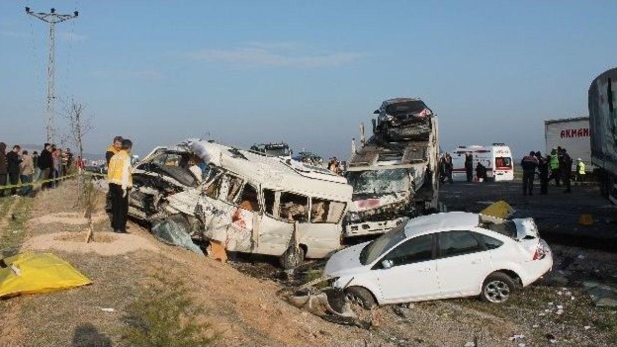 Konya’da meydana gelen zincirleme trafik kazasında 9 kişi öldü, 11 kişi de yaralandı.Kaza, saat 07.00 sıralarında Konya-Afyonkarahisar karayolunun 40. kilometresi Sarayönü ilçesi yakınlarında meydana geldi. Edinilen bilgiye göre, Afyonkarahisar istikametine giden Halil İbrahim Esen idaresindeki 33 CLB 16 plakalı TIR, bölünmüş yoldan karşı şeride geçerek Sarayönü ilçesinden Konya’ya yolcu taşıyan Osman Demirkol’un (55) kullandığı 42 Z 4723 plakalı yolcu minibüsüne çarptı. Minibüse de arkasından gelen Sebahattin Özşuray (42) yönetimindeki 34 BH 6873 plakalı otomobil yüklü çekici çarptı. Kazada minibüs ve çekicinin sürücüleri ile minibüste yolcu olarak bulunan Dilek Demirkaya (32), Sadi Önal (51), Sıtkı Büyüksarı (51), Fehmi Bakırcı (56) ve İmdat Gümüş (37) olay yerinde hayatını kaybetti. Ağır yaralı olarak ambulanslarla Selçuk Üniversitesi Tıp Fakültesi Hastanesi’ne kaldırılan TIR sürücü Halil İbrahim Esen (60) ve Ahmet Solak tüm müdahalelere rağmen kurtarılamadı. Yaralılar Sait Karagül, Kadir Büyüksarı (39), Muhammet Ramazan Bayraktar (25), Tahsin Baybolat (27), Sadrettin Topal (21), Ahmet Solak (46), Salih Gezer (18) ve Ömer Ünal'ın tedavileri Konya'daki çeşitli hastanelerde sürerken, ayakta tedavi gören 3 kişi de taburcu edildi.Kaza haberini alan minibüs yolcularının yakınları olay yerine gelerek sinir krizleri geçirdi. Yapılan incelemelerin ardından hayatını kaybedenlerin cansız bedenleri otopsi için hastane morguna kaldırıldı. Bir süre ulaşıma kapanan yol, araçların kaldırılması ile yeniden trafiğe açıldı.