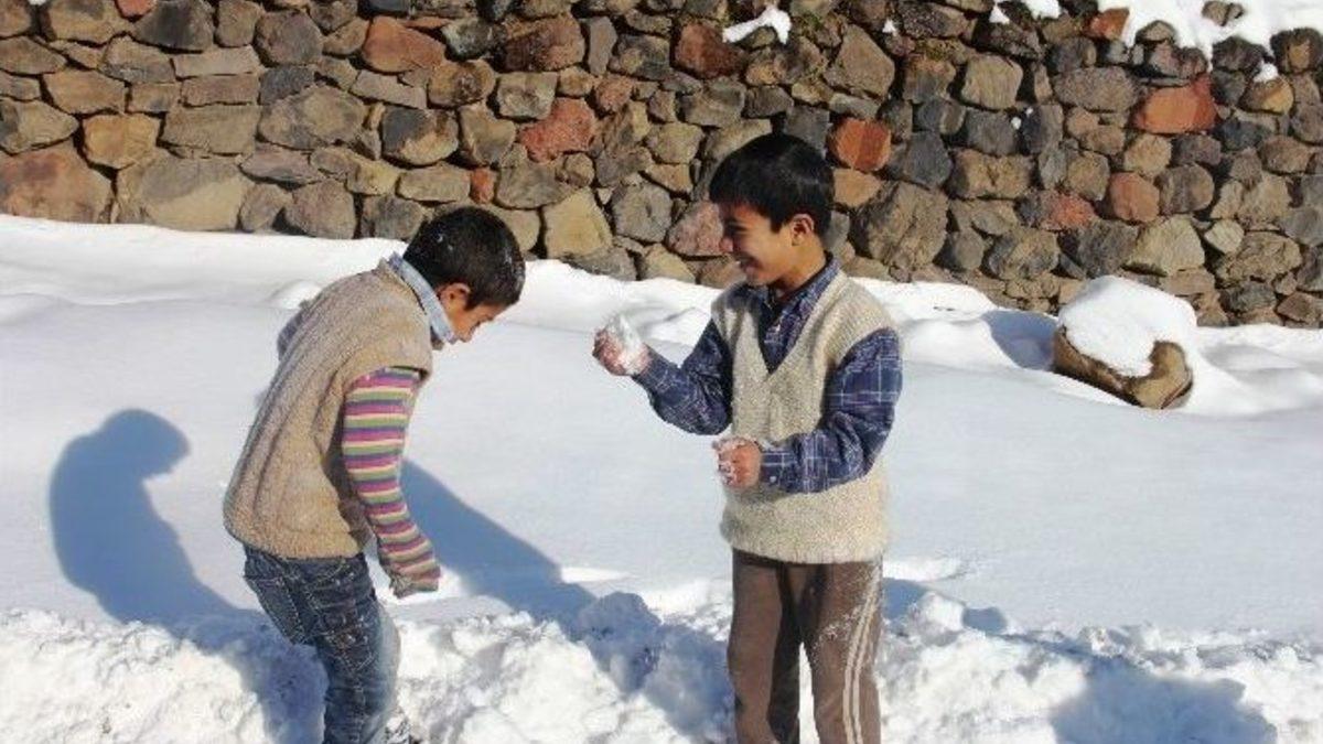 Iğdır’da kar yağışının etkili olduğu yüksek kesimlerdeki köylerde bulunan öğrenciler, teneffüste kartopu oynayarak beyaz örtünün tadını çıkarıyorlar.Iğdır Ovası’nda yağmur yağarken, yüksek kesimlerde etkili olan kar yağışı ise köyleri beyaza bürüdü. Kar kalınlığının yer yer 15 ile 30 santimetreye ulaştığı Kervansaray köyünde yaşayan çocuklar da enerjileriyle soğuk kış günlerini ısıtmayı başarıyor.Kervansaray Ortaokulu’nda eğitim gören çok sayıda öğrenci, teneffüs zilinin çalmasının ardından oyun parkı yerine karla kaplı alanlara koşuyor. Burada kartopu oynayan ve kar güreşi yapan çocuklar, beyaz örtünün keyfiyetini yaşıyorlar.Havanın soğukluğuna aldırış etmeyen çocuklar, oynadıkları oyunun etkisiyle adeta kendilerinden geçiyorlar.Bir haftadır köylerinde kar yağışının etkili olduğunu anlatan minikler, kendilerinin ders aralarından kartopu oynayarak ve kar güreşi yaparak eğlendiklerini söylediler.