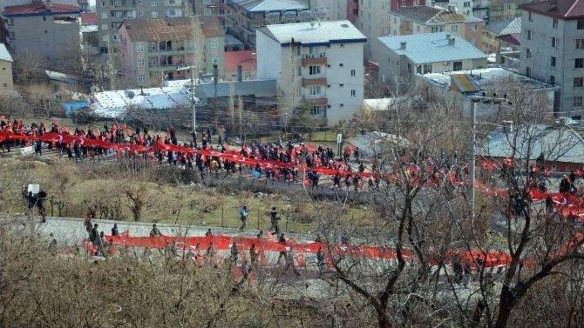 Diyarbakır’ın Kulp ilçesinde düzenlenen mitinde bir araya gelen yüzlerce vatandaş, 140 metre uzunluğunda Türk bayrağı açarak, teröre tepki gösterdi.Diyarbakır’ın Kulp ilçesinde, Anadolu Güvenlik Korucuları ve Şehit Aileleri Konfederasyonu öncülüğünde, “Teröre lanet, şehide saygı” mitingi düzenlendi. Miting için Yeni Mahallede bir araya gelen yüzlerce kişi, 140 metre uzunluğunda Türk bayrağı açıp, “Kahrolsun PKK” sloganları atarak, Turgut Özal Caddesindeki kaymakamlık binası önüne kadar yürüdü. Burada Kur’an’ı Kerim tilavetinin okunmasıyla başlayan mitingde, şehitler için saygı duruşunda bulunulup, İstiklal Marşı okundu.Daha sonra konuşma yapan Anadolu Güvenlik Korucuları ve Şehit Aileleri Konfederasyonu Genel Başkanı Ziya Sözen, “Kulp halkı teröre karşı hep dik durmuştur. Kulp halkı dik durduğu için hain, alçak, şerefsiz PKK terör örgütü Kulp halkını çeşitli zamanlarda cezalandırmıştır. 1 Ocak 1995 yılında Hamzalı köyünde terör örgütü PKK 23 vatandaşımızı hunharca katletmiştir. O vatandaşlarımızın içinde 6 aylık Fatma bebek, 23 yaşındaki Aysel Tanrıverdi, 85 yaşındaki Tayyip dedemiz de vardı. Biz Kulp halk olarak unutmadık. Bundan sonra da unutmayacağız. PKK terör örgütünün arkasındaki siyasi uzantısı da asla Kürt değildir, asla Kürt halkının temsilcisi değildir” dedi.Öğretmen Elif Ruşen Taşkıran ise hep beraber tek yürek olduklarını ifade ederek, “Ülkemizin en zor zamanlarından birini yaşıyoruz. Bu zor durumlardan kurtulmamız için dua ediyorum. Hepimiz bir olursak ülkemiz aydınlığa kavuşacaktır” diye konuştu.Müzik öğretmeni Duygu Korkmaz da birlik ve beraberlik çağrısında bulunarak, “Ülkemizde korku kültürünün yayılmaması için eğitimciler olarak buradayız. Hangi şehirde olursak olalım biriz tekiz. Her ne olursa olsun ülkemiz devam edecek. Biz buradayız” ifadelerinde bulundu.Grup, açıklamaların ardından dağıldı.