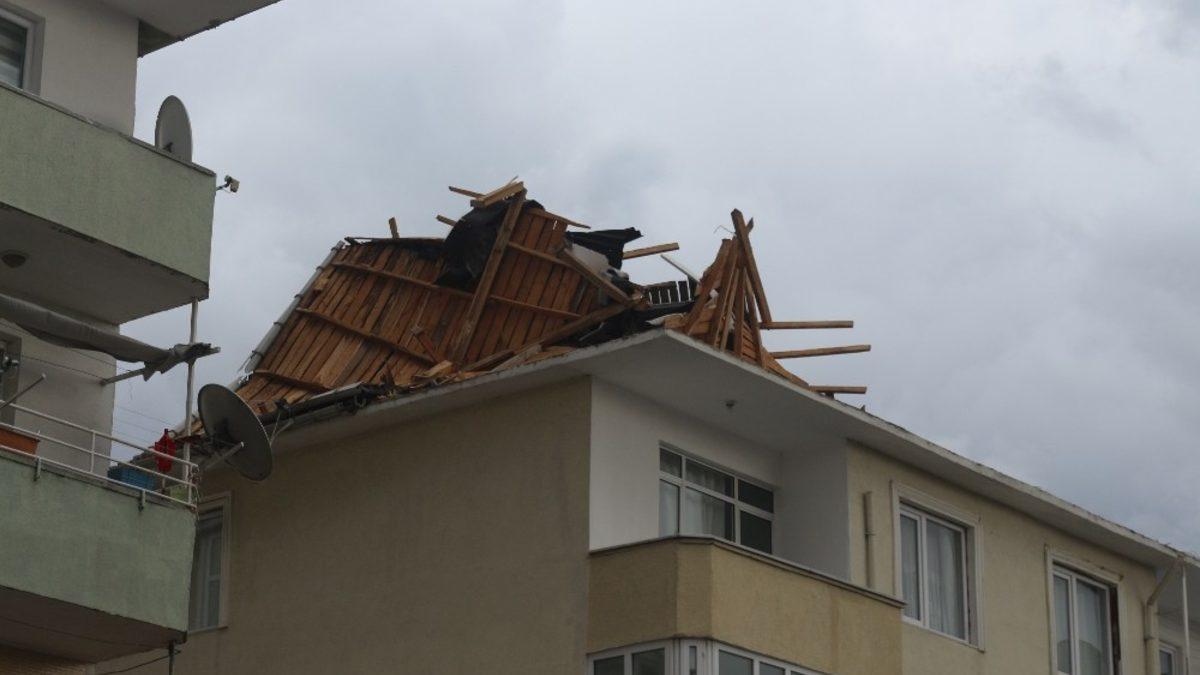 Tekirdağ’da sabah saatlerinde etkisini gösteren şiddetli rüzgar nedeniyle bir apartmanın çatısı uçtu.