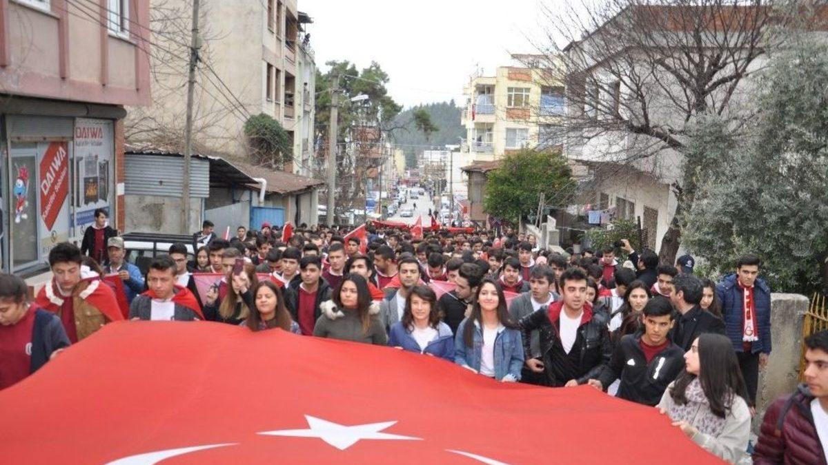 Osmaniye’nin Kadirli ilçesinde lise öğrencileri Afrin’deki terör örgütlerine karşı düzenlenen Zeytin Dalı Harekatı’na destek için yürüyüş yapıp askerlik şubesine gönüllü asker olmak için başvuruda bulundular.Kadirli ilçesinde faaliyet gösteren Özel Çukurova Temel Lisesi’nde okuyan yaklaşık 400 öğrenci, öğretmenleri ve okul idarecileri eşliğinde Atatürk Caddesi’nde toplanıp ellerinde Türk bayrakları ile yürüyüş yaptı. “Şehitler ölmez vatan bölünmez”, “Hepimiz Mehmediz” şeklinde sloganlar ile yürüyüş yapan lise öğrenciler daha sonra Kadirli Askerlik Şubesi önüne geldiler. Burada saygı duruşu ve İstiklal Marşı’nın okunmasının ardından okul müdürü Yemen Deniz öğrenciler adına toplanan dilekçeleri Kadirli askerlik şubesine teslim etti. Deniz, “Öğrencilerimiz bize böyle bir taleple geldiklerinde çok mutlu olduk. Kurtuluş savaşımızda bir çok liseden, okuldan nasılda mezun verilmediyse bizde şu anda Mehmetçiğimize destek oluruz. Asker olmak istiyoruz şeklinde öğrencilerimiz talepte bulundular. Bizde okul idarecileri olarak çok mutlu olduk ve bugün burada 150’si kız öğrencilerimiz olmak üzere 400 öğrencimiz askerlik şubesine hitaben yazdıkları gönüllü asker olmak istediklerine dair dilekçemizi teslim ettik. Öğrencilerimizle gurur duyuyoruz” şeklinde konuştu.Kadirli Askerlik Şubesinin önünde öğrenciler komando andı yaptıktan sonra dağıldılar. Kadirli Belediye Başkanı Dr. Ömer Tarhan da öğrencilere destek için beraber yürüdü.