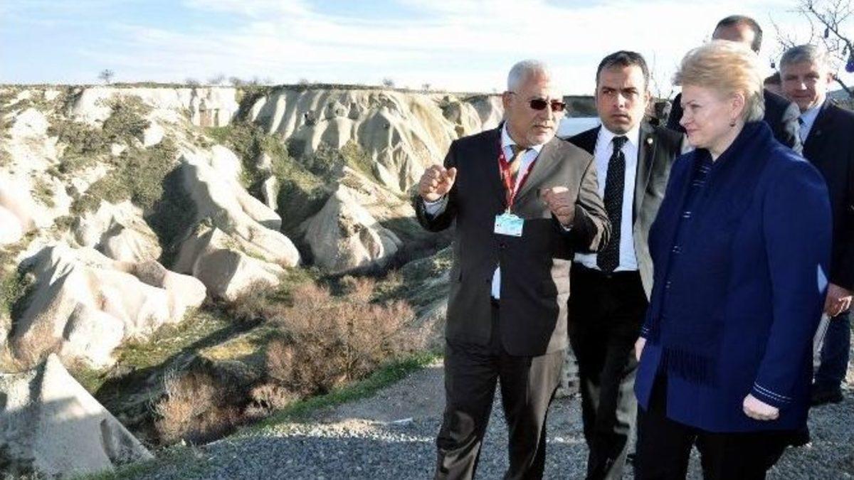 Litvanya Cumhurbaşkanı Dalia Grybauskaite’nin resmi temaslarda bulunmak üzere geldiği Türkiye’de ilk durağı Kapadokya oldu. Konuk Cumhurbaşkanı Türkiye’nin önemli turizm merkezlerinden Kapadokya bölgesini gezdi.Çeşitli temaslarda bulunmak üzere Türkiye’ye gelen Litvanya Cumhurbaşkanı Dalia Grybauskaite, öğle saatlerinde hava yolu Kapadokya Tuzköy Havalimanı’na geldi. Nevşehir Valisi Mehmet Ceylan tarafından karşılanan konuk cumhurbaşkanı, daha sonra Kapadokya bölgesinin tarihi ve turistik merkezlerini gezdi.Kapadokya gezisi sırasında peribacalarının, kayadan oyma kilise ve şapellerin bulunduğu Göreme Açık Hava Müzesi, Paşabağları, Zelve Ören Yeri ve Uçhisar’ı gezen Litvanya Cumhurbaşkanı Dalia Grybauskaite, Avanos ilçesine bağlı Özkonak beldesinde bulunan Özkonak Yeraltı Şehri’ni de görme fırsatı buldu.Litvanya Cumhurbaşkanı Dalia Grybauskaite, Uçhisar beldesinde bulunan Güvercinlik Vadisi ziyareti sırasında turistik eşya satıcılarının tezgahlarını da gezdi. Nazar boncukları ve şalları yakından inceleyen konuk cumhurbaşkanı yaptığı açıklamada Kapadokya bölgesini çok beğendiğini söyledi.