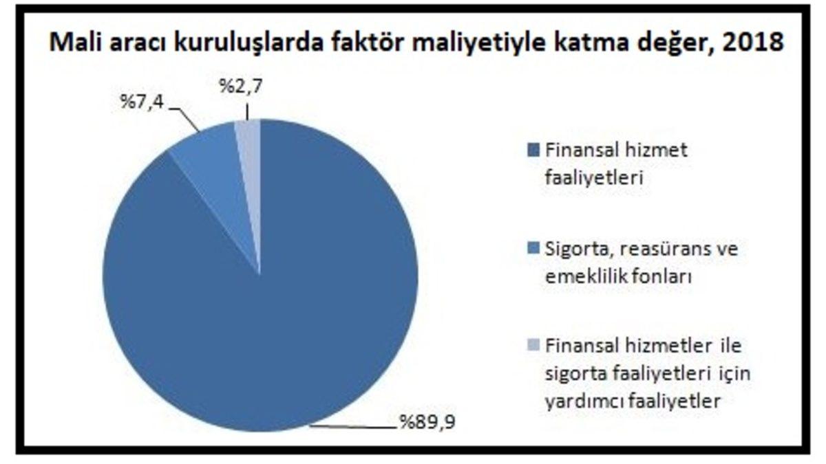Türkiye İstatistik Kurumu'nun verilerine göre, mali aracı kuruluşlarda toplam katma değerin yüzde 89.9'u finansal hizmet faaliyetlerinde, yüzde 7.4'ü sigorta, reasürans ve emeklilik fonları faaliyetlerinde, yüzde 2.7'si de finansal hizmetler ile sigorta faaliyetleri için yardımcı faaliyetlerde oluştu.