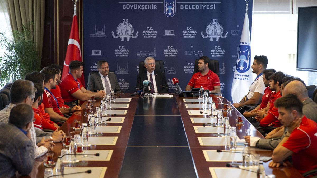 Ankara Büyükşehir Belediyesi Başkanı Mansur Yavaş, Sırbistan'da düzenlenen Dünya Güreş Şampiyonası'nda altın madalya kazanan ASKİ Spor'un milli güreşçileri Taha Akgül ve Rıza Kayaalp'i kabul etti.