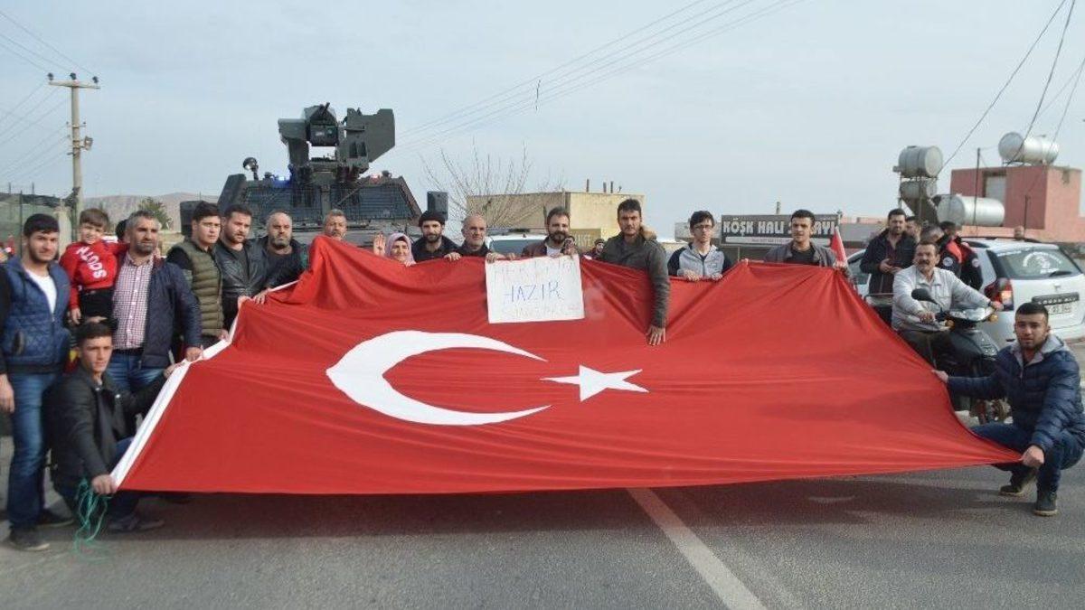 Mardin’de vatandaşlar, Afrin’de düzenlenen Zeytin Dalı Harekatı’na bayraklı yürüyüş yaparak destek verdi.Yüzlerce vatandaş 15 Temmuz Şehitler Parkında bir araya gelerek il jandarma komutanlığına yürüdü, askerleri omuzlayan vatandaşlar ’Reis bizi de Afrin’e gönder’ sloganları atarak operasyondaki asker ve polise dualar etti.Mardin’de sosyal medya üzerinden bir araya gelen yüzlerce vatandaş, Türk Silahlı Kuvvetlerinin (TSK) Afrin’de yürüttüğü Zeytin Dalı Harekatı’na destek vermek için ellerinde Türk bayrakları ile İl Jandarma Komutanlığına yürüdü. ’Vatan hainlerine idam’, ’Ne mutlu Türküm diyene’, ’Vatan sana canım feda’, ’Reis bizi askere gönder’ sloganları atan vatandaşlar, kucaklarında çocukları ile metrelerce yürüdü. İl Jandarma Komutanlığının önünde bir süre slogan atan vatandaşlara Artuklu 1071 Derneği, AK Parti ve MHP’den de çok sayıda partili katıldı. Kucağında 7 aylık bebeği ile yürüyüşe katılan bir anne, bu operasyonu desteklediklerini ifade etti.5 evladını Afrin operasyonuna göndermeye hazır olduğunu söyleyen Zahide Aşar da, operasyona destek verdiğini belirterek, "5 evladım ve kendim bu operasyona gitmeye hazırız. Ülkemiz için feda olsun” dedi.Mardin İl Jandarma Komutanlığı önünde yürüyüşü sonlandıran vatandaşlar, askerleri omuzlarına alarak dualar etti.