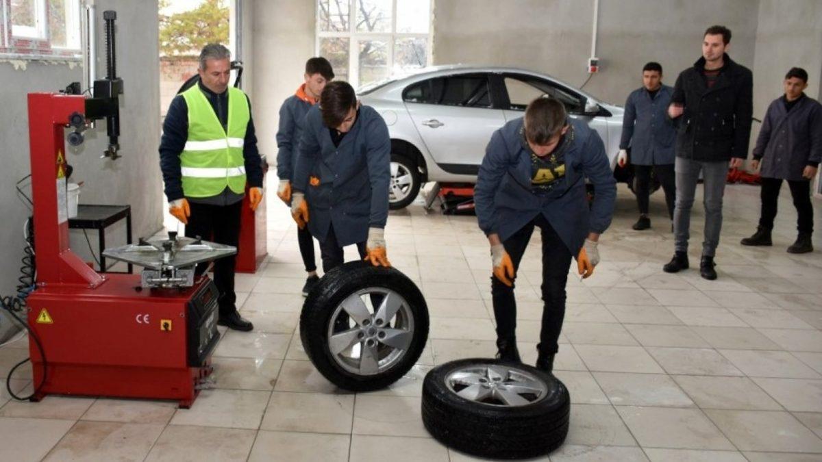 Açılışın ardından öğrenciler bakım için gelen araçların lastik değişimi ve yağ bakım kontrollerini gerçekleştirdi.