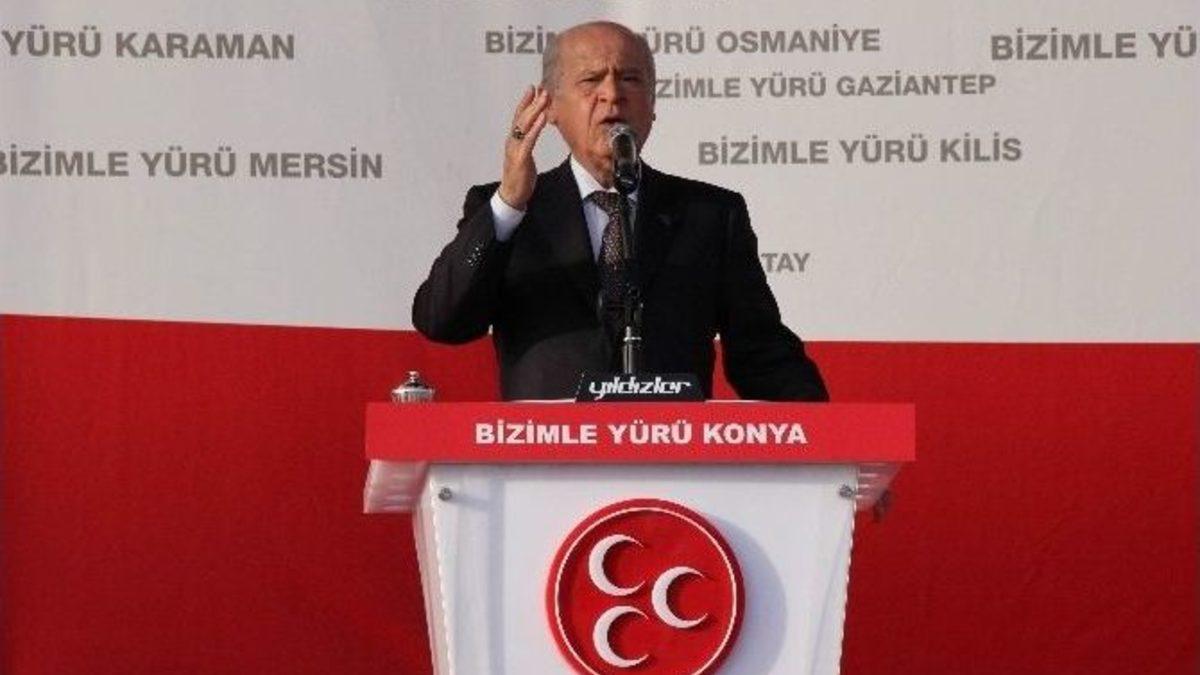Milliyetçi Hareket Partisi (MHP) Genel Başkanı Devlet Bahçeli, herkesin korku içinde yaşadığını söyledi.MHP Genel Başkanı Devlet Bahçeli, Konya kent meydanında düzenlenen mitingde partililere seslendi. Bahçeli, Türkiye’de herkesi korku içinde yaşadığını, dinlendiğini, izlendiğini, fişlendiği düşündüğünü ifade etti. Bahçeli, “AKP devlet gücünü korku salmak amacıyla kullanmaktadır. AKP’nin Konya ile gönül köprüsü çökmüştür. Biliyorum başbakan hemşehrinizdir, buna saygı duyuyorum. Fakat içinizden çıkan Davutoğlu, Konya’nın ülkü ve ilkeleriyle çelişmektedir. Yanlıştadır, yozlaşma kulvarındadır ve çürümenin içindedir. Konyalı kardeşlerim şimdi soruyorum sizlere, Başbakan Davutoğlunu tasvip ediyormusunuz, iradesini Erdoğan tapulamasını doğru buluyormusunuz. Sero Ahmet olmakla övünmesini kabul ediyormusunuz. Taşıdığı makamı Başkanlık sistemine çivilemesini, Başbakanlığı imha etmek için çalışmasını yerinde görüyormusunuz. Cevabınız hayırsa Davutoğlu Konyalıdan hangi siyasi amaç için destek isteyecektir. Ben Başbakan olmak istemiyorum Erdoğan’ı başkan yapmak istiyorum, her şey başkanlık sistemi içindir derse Konyalı buna ne cevap verecektir. Konya’nın kendisine bağladığı ümitlere haksızlık değilmidir. Konyalı, Selçuklu Kartalı gibi kudretin simgesidir. Peki Davutoğlu bunlardan hiç mi ibret almaz, hiç mi sonuç çıkarmaz” dedi.“KONYALIYI AŞAĞILAMA KİMSENİN HADDİ DEĞİLDİR”Başbakan Davutoğlu’nu, Konyalılara hakaret ettiği iddia edilen bir iş adamına suskun kalmakla da eleştiren Devlet Bahçeli, “Erdoğan’a kendisini ve ailesini kurban etmek isteyen havuz medyasının meşhur isimlerinden birisi geçtiğimiz günlerde Konya’ya hakaret etmiştir. Maalesef şuana kadar Davutoğlundan bir eleştiri ve tepki gelmemiştir. Bu şahıs diyor ki, ‘Kayserililer Konyalılar gibi 360 derece dönmezler’. Ne demeye çalışmaktadır. Konyalıya dönemki demek istemektedir. Davutoğlu neredesin, bu çirkin itham ve yoruma ne diyeceksin. Konyalı dönerse sadece Allahın huzurunda döner, sema da döner. Konyalıyı aşağılama hiç kimsenin haddine değildir. Davutoğlu madem yüreklisin çık da bu sözlere oturaklı bir cevap ver, karşılık ver. Muhatabına dünyanın kaç bucak olduğunu göster” diye konuştu.AK Parti Genel Başkanı ve Başbakan Ahmet Davutoğlu’nun, MHP’nin darbelere mertçe karşı çıkmadığı yönünde eleştirisine karşılık veren Bahçeli sözlerine şöyle devam etti; “Biz CHP ile paslaşıyormuşuz. Sayın Davutoğlu, biz darbelere direnirken sen duvar dibinde geziyor gölgenden bile korkuyordun. Biz darbelerin en ağır maliyetine maruz kalırken sen ona buna şirinlik yapmak ve yakayı kurtarmakla meşguldün. Şunu bilesin ki biz kimseyle paslaşmaz ver kaça girmeyiz. Bu ilkellik ancak AKP’yi müstahak bir özellik. Sayın Davutoğlu, HDP ile saraylarda buluştuğunuzu, İmralı seferleri için müşterek planlar yaptığınızı ne çabuk unuttunuz. Bebek katilinin müşahitliği altında pazarlık masalarına oturduğunuzu nasıl hafızalardan çıkardınız”“CUMHURBAŞKANI’NIN TARAFSIZLIĞINA KİM İNANIR”Devlet Bahçeli, Cumhurbaşkanı Erdoğan’ın tarafsız olmadığını ve mitinglerle iktidar partisine destek istediğini ileri sürdü. Bahçeli, “Tayyip Erdoğan demiş ki, her partiye eşit mesafedeyim ama gönlümde de bir aslan yatıyor. Gönlünde yatanın bir aslan mı çakal mı olduğunu bilemeyiz. AKP’nin seçim beyannamesini okuduğunu da ağzından kaçırarak siyasi ahlaksızlık tarihine geçen bir olaya imza atan bir cumhurbaşkanının mevcudiyeti zaten büyük bir talihsizliktir. Milletimiz için darbeciler kadar yüz karasıdır. AKP’ye oy veren vatandaşlar da dahil bu yalana kim inanır. Şimdi Erdoğan’ın bütün partilere aynı mesafede olduğunu söylemesi en büyük siyaset tarihinin en büyük ahlaksızlarından birisidir. Tarafsızlığından zaten vazgeçtik ama hala tarafsız olabildiğini ileri sürecek derecede yalana başvurması için yolun sonunun geldiğini görmüştür. Erdoğan AKP’deki düşüşü görmüştür, foyasının ortaya çıkacağının paniğini yaşamaktadır. Derdi ve tasası budur. Yalan riya talan sona yaklaşmıştır. bu hesap verme korkusudur, bu rezil olmak korkusudur, bu yüce divan korkusudur.Bizim Erdoğan’a tavsiyemiz şudur; gel gereksiz açıklamalardan vazgeç AKP’nin tarafı olmak sana çok yakışıyor. Kukla genel başkanını al mitinglere beraber çıkın. Elinizden geleni ardınıza koymayın. Ne yaparsanız yapın hesap vermekten kurtulamayacaksınız. Allahın izniyle Türkiye’de Konya’da ilkesiz dengesiz bir iktidarın tükenişine şahit olacaktır” şeklinde konuştu.