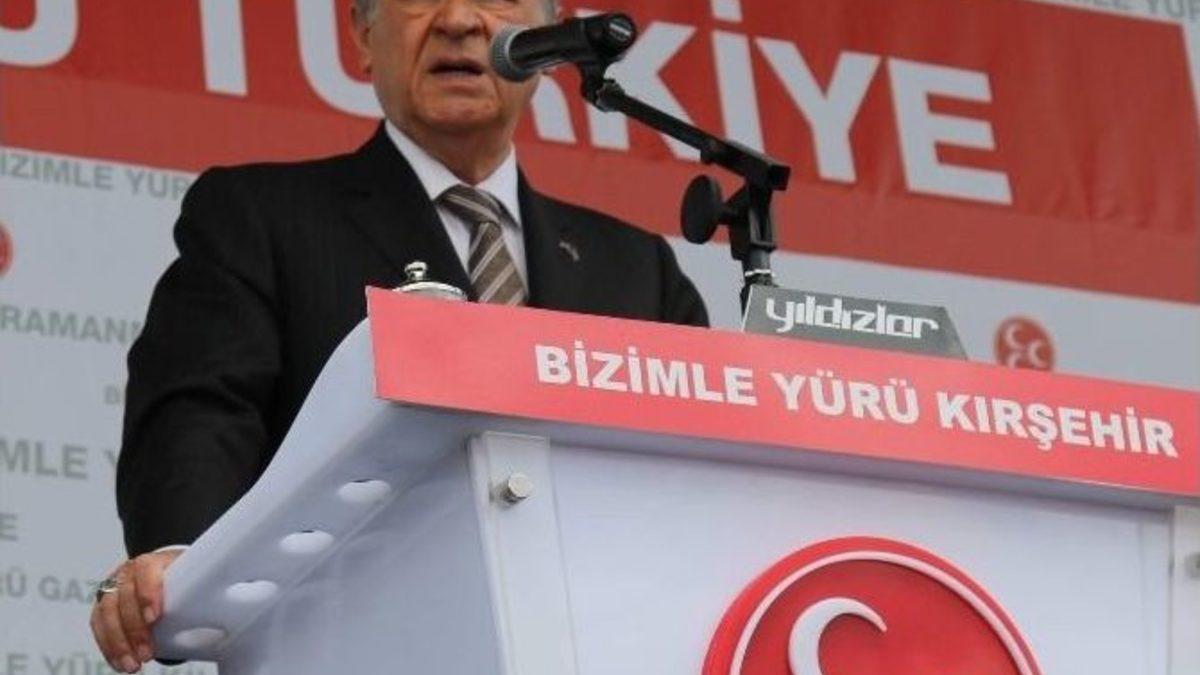 Milliyetçi Hareket Partisi (MHP) lideri Dr. Devlet Bahçeli, "Bizler yüzümüzü hakka dönerek yürüyoruz. Milliyetçilik haram değildir yenmez, yalan değildir söylenmez. Bilinsin ki HDP ile MHP rüyada bile bir araya gelemez" dedi.Kırşehir’de Cacabey Meydanında halka hitap eden Bahçeli, "Cacabey’in emanetleri Kırşehir’dedir. Öyle diyor merhum ozanımız Neşet Ertaş; ’Garibim gönül sarar, gönül bileni sorar. Bu gönül yarasını, gönlü bilen sarar’ Biz, hatır bildiğimiz gibi gönül de biliriz; bunun için de Kırşehir’in gönül yarasını sarmaya talibiz, sorunlarına çare olmaya hazırız; bu nedenle yemin ettik, iktidara yürüyoruz. Feyzimizi Ahi Evran’dan alarak yürüyoruz. Heyecanımızı Baba İlyas’tan alarak yürüyoruz. Yönümüzü Hakk’a dönerek, yüzümüzü iman ve ihlaslı vicdanlara çevirerek yürüyoruz. Elimizi, soframızı, kapımızı açmak için yürüyor, Ahilikte buluşuyoruz" diye konuştu.MHP lideri Bahçeli, Türkiye’yi uçuruma iten iktidara karşı yürüme vaktinin geldiğini söyleyerek, "Türkiye’yi uçurumun kenarına getiren AKP’ye karşı yürümek vaktidir. Hırsıza karşı yürümenin zamanıdır. Rüşvetçilere, kalpazanlara, kaçakçılara, bölücülere, kul hakkını midesine indiren haramzadelere karşı yürümekten başka seçenek kalmamıştır. Yürümezsek akıbet korkunçtur. Yürümezsek gelecek karanlıktır.Yürümezsek Türkiye’nin ufku kapanacaktır. Kırşehirli esnaf için yürüyoruz. Kırşehirli işçi için yürüyoruz. Kırşehirli emekli için yürüyoruz. Kırşehirli yetim, öksüz, dul, garip, mazlum, işsiz, yoksul için yürüyoruz. Çünkü sizlerin sözü bir, özü bir, karakteri sağlamdır. Sizin bu duruşunuz yalancılara, yandan çarklılara ve yardakçılıkta sınıf atlayanlara en iyi cevaptır. Bozkırın ufku hamd olsun açılmıştır. Umutlar yeşermiş, güzel günlerin müjdesi bugün bu meydandan verilmiştir. Sizler burada dik durdukça, birilerinin uykusu kaçmaktadır. Milliyetçi Hareket Partisi Kırşehir’in teveccühünü kazandıkça, birilerinin yüzü asılmaktadır. Türk milleti Milliyetçi Hareketle yürüyeceğinin işaret ve sözünü verdikçe, birileri şok geçirmekte, bunalıma girmektedir. Fakat ne yapsalar boştur. Hangi tuzak ve tezgahı kursalar işe yaramayacaktır. Zira Milliyetçi Hareket Partisi gümbür gümbür iktidara yürümektedir. Korkuları budur. Hırçınlıkları, hasislikleri, hayasızlıkları ve hezeyanları bundandır. Başbakan iyice çirkefleşmiş, çamura yatmıştır. AKP’deki inişin farkındadır. AKP’deki yıpranma ve yozlaşmanın bilincindedir. AKP’nin kayıp gittiğini, iktidardan paldır küldür düştüğünü görmektedir. AKP’nin haram saltanatının artık sonu görünmüştür. 17-25 Erdoğan’ın zorba ve kanun tanımaz tavrı Kırşehir’in hisarlarına çarpacaktır. Davutoğlu ve Erdoğan sonunda müştereken meydanlara da çıkmıştır" ifadelerini kullandı."HDP İLE MHP RÜYADA BİLE YAN YANA GELMEZ"Bahçeli, konuşmasını şöyle sürdürdü:"Devleti suçladılar, rahata kavuştular. Tarihe hakaret ettiler, servetlerine servet kattılar. Oslo’dan İmralı’ya kadar PKK’ya ne istediyse verdiler, bölücülükte ustalaştılar. Bunlarda ne utanma vardır, ne de Allah korkusu kalmıştır. Bunlarda ne merhamet vardır, ne de vicdan ve insanlık kalmıştır. İşte Erdoğan, işte Davutoğlu her şeyin canlı şahididir. Başbakan Trabzon’da diyor ki; ‘HDP bir pas attı, MHP’de göğsünde topu indirdi.’ Davutoğlu futbola fazla merak salmıştır. Attığı uyduruk ve mizansen 3 golden de anladığımız budur.Fakat Başbakan’ın bonservisi çoktandır HDP ve PKK’nın elindedir. Davutoğlu ne kadar saklasa da faydasızdır; çünkü PKK’ya ruhen ve fikren uzun zaman önce transfer olmuştur. Davutoğlu, 17-25 Erdoğan’ın yolsuzluk liginde parlamış, PKK’nın kanlı elinde sivrilmiştir. Ve bölücülüğün yıldız oyuncusu olmak için ter dökmekte, küresel menajerlerini devreye koymaktadır. HDP’yle partner olduklarını söyleyenler 7 Haziran yaklaştıkça iftiralarını hızlandırmışlardır. PKK’yla gece gündüz ihanet idmanı yapanlar 7 Haziran yaklaştıkça bilye dağıtmaya başlamışlardır. Davutoğlu’nun, HDP’yle MHP’yi rüyada bile yana yana getirmesi iblisin kendisine bir oyunu, küresel simsarların kabus planıdır. Molotofçu olan, molotofçulara, kan döken vampirlere fidanlar diyen Davutoğlu’dur. Siyasi bombacı, siyasi suikastçı, siyasi sabotajcı da aynı kişidir. Allah’a çok şükür; MHP, İmralı canisinden emir almadı, asla almaz. MHP, Kandil’deki terör çetesine ricacı olmadı, asla böyle bir zillete düşmez.""MİLLİYETÇİLİK HARAM DEĞİLDİR YENMEZ YALAN DEĞİLDİR SÖYLENMEZ"Kırşehir’de milliyetçiliğin tarifini yapan Bahçeli, "Davutoğlu bil ki; milliyetçilik oyun değildir, oynanmaz. Milliyetçilik haram değildir, yenmez. Milliyetçilik yalan değildir, söylenmez. Milliyetçilik kilim değildir, çiğnenmez.Milliyetçilik fındık değildir, fındık kurtları hiç bilmez. Nedir peki? Milliyetçilik bir inanç, irfan ve iddiadır. Milliyetçilik bir ülkü, fazilet ve sadakattir. Milliyetçilik kimlik, kişilik ve öz güvendir. Milliyetçilik, milletine kara sevdalı ve mensubiyet aşkıyla dolmuş kutlu yüreklerin manevi mükafatıdır. Milliyetçilik Türk ve İslam’ın zafer sancağıdır. Türküm diyenlerin nişanesidir milliyetçilik. Müslümanım diyenlerin divanesidir milliyetçilik.Vatan diyenlerin dimağıdır milliyetçilik. Bayrak diyenlerin direncidir milliyetçilik" diyerek konuşmasını tamamladı.