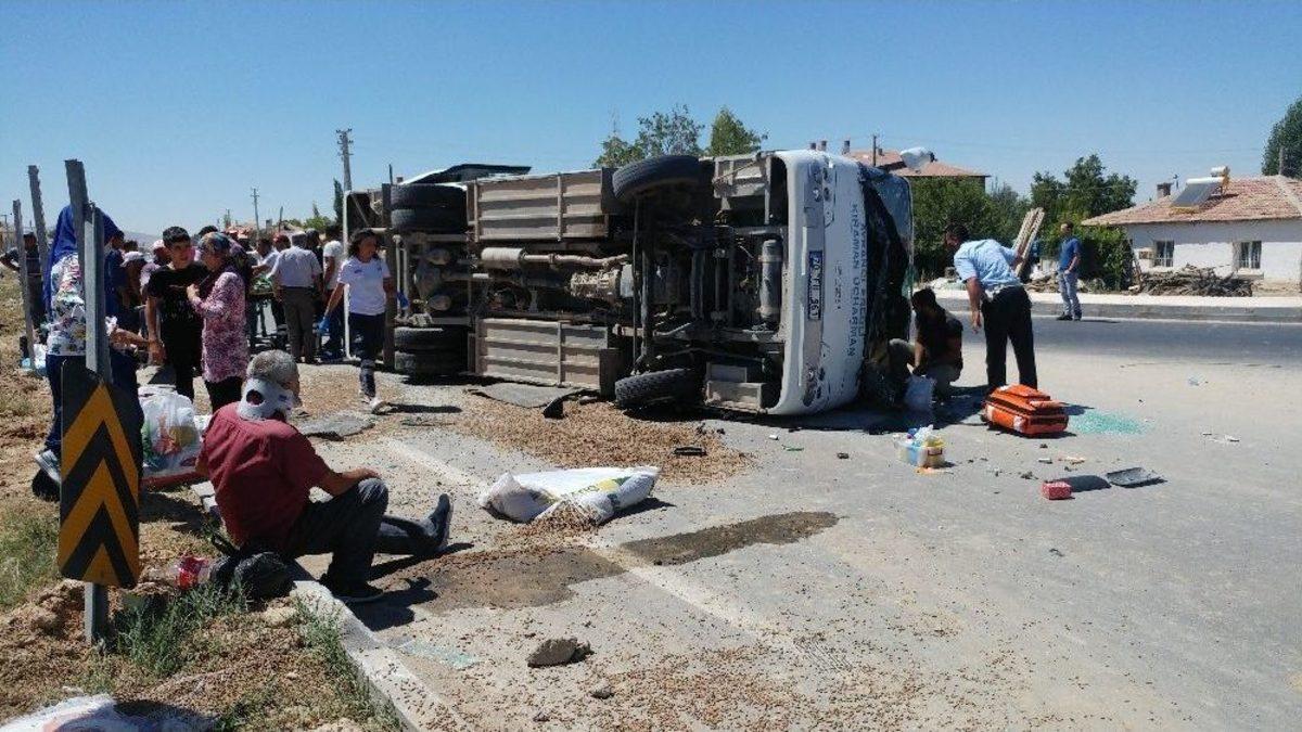 Konya’nın Ereğli ilçesinde midibüsle tırın çarpışması sonucu meydana gelen trafik kazasında 9 kişi yaralandı.Kaza, Yeni Karaman Çevre Yolu kavşağında meydana geldi. Edinilen bilgiye göre, Ereğli’den Karaman’ın Ayrancı ilçesine gitmekte olan İbrahim E. (47) idaresindeki 70 FH 961 plakalı midibüs ile Salih Ç. (60) idaresindeki 14 AAF 508 plakalı tır çarpıştı. Çarpmanın etkisiyle devrilen midibüsteki yolculardan Y.K. (14), Duran E. (24), Hatun E. (22), Nefaret K. (47), Ahmet T. (67), Berika T. (62), Mustafa Y. (73) ile araç sürücüleri İbrahim E. ve Salih Ç. yaralandı. Kaza ihbarı üzerine olay yerine polis ve çok sayıda ambulans sevk edildi. İlk müdahaleleri yapılan yaralılardan bazıları kaldırımda takviye ambulansların gelmesini bekledi. Yaralanan 9 kişi ambulanslarla Ereğli Devlet Hastanesine kaldırılarak tedavi altına alındı. Kazanın ardından polis olay yerinde incelemelerde bulundu.Ereğli Kaymakamı Ömer Lütfi Yaran ve ilçe Emniyet Müdürü Necdet Ercan da kaza yerine giderek bilgi aldı.Kazayla ilgili soruşturma başlatıldı.