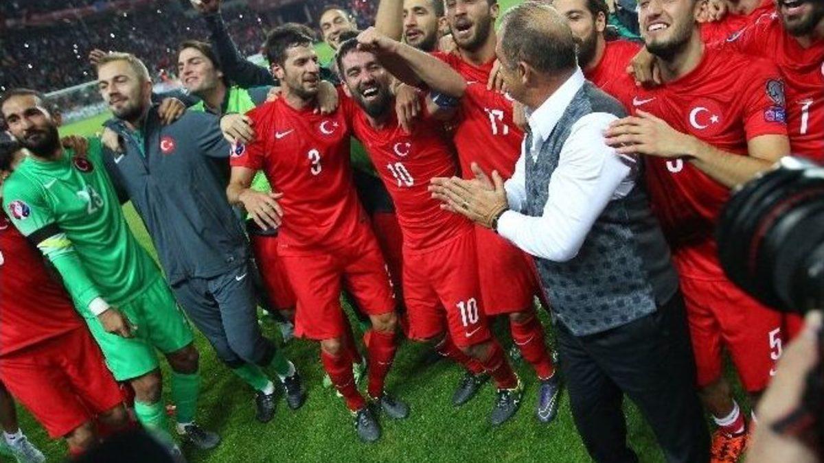 İzlanda’yı 1-0 mağlup ederek en iyi üçüncü olarak 2016 Avrupa Şampiyonası finallerine katılma hakkı kazanan A Milli Futbol Takımı’nın soyunma odasındaki sevinç kareleri paylaşıldı.Ay-yıldızlılar dün İzlanda’yı Konya’da Selçuk İnan’ın 89. dakikadaki serbest vuruş golüyle 1-0 mağlup etti ve Fransa’da düzenlenecek olan EURO 2016 finallerine katılma hakkı elde etti. Millilerin karşılaşma sonrası soyunma odasında yaşadığı coşkunun fotoğrafları Türkiye Futbol Federasyonu’nun resmi internet sitesinden yayınlandı.