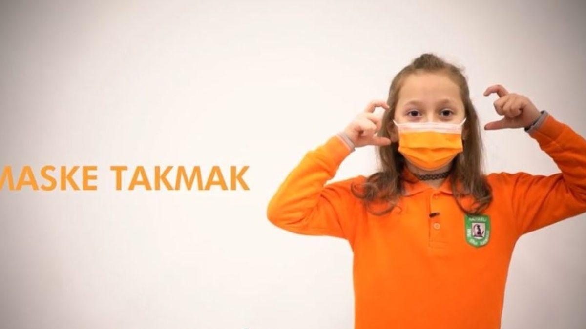 Tüm dünyayı etkisi altına alan ve ülkemizde de görülen Covid-19 salgının en önemli tedbirleri olan temizlik, maske ve mesafe kurallarına daha da dikkat edilmesi için öğrenciler kamera karşısına geçti. Öğrenciler, ‘Keyifli Okul Atölyem’ projesi kapsamında öğretmenleri Havva Hamzalı eşliğinde çektikleri video klipte işaret dili ile temizlik, maske ve mesafe kuralına dikkat çektiler.
