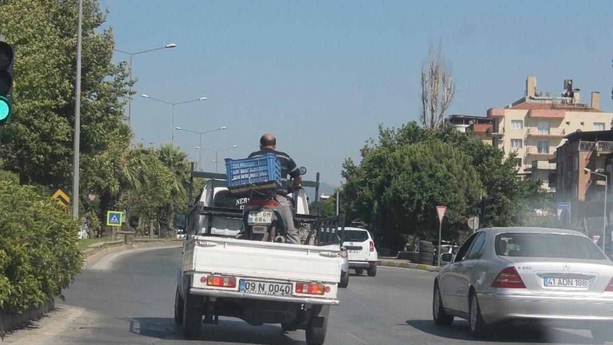 Aydın İzmir kara yolunda bir motosiklet sürücüsünün motoruyla kamyonetin üzerinde yolculuk yapması görenleri şaşırttı.