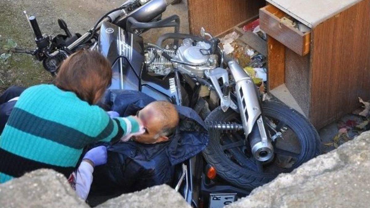 Gaziantep’in İslahiye ilçesinde seyir halindeki bir motosiklet sürücüsü, gaza fazla yüklenince oturduğu apartmanın giriş kapısının önündeki boşluğa düştü. Yaralanan sürücü hastaneye kaldırıldı.Edinilen bilgiye göre, Hacı Ali Öztürk Mahallesi Bedduüzaman Caddesi üzerinde bulunan apartman önüne park ettiği 27 R 8101 plakalı motosikletine binen Hasan Aslan (45), gaza fazla yüklenmesi sonucu motosikletiyle birlikte oturduğu apartmanın önüne düştü. Apartmanın giriş kapısı önündeki boşluğa düşen motosikletin sürücüsü Aslan, olay yerine çağrılan ambulansla İslahiye Devlet Hastanesine kaldırdı.Olay yerine çağrılan polis ise kazayla ilgili inceleme başlattı