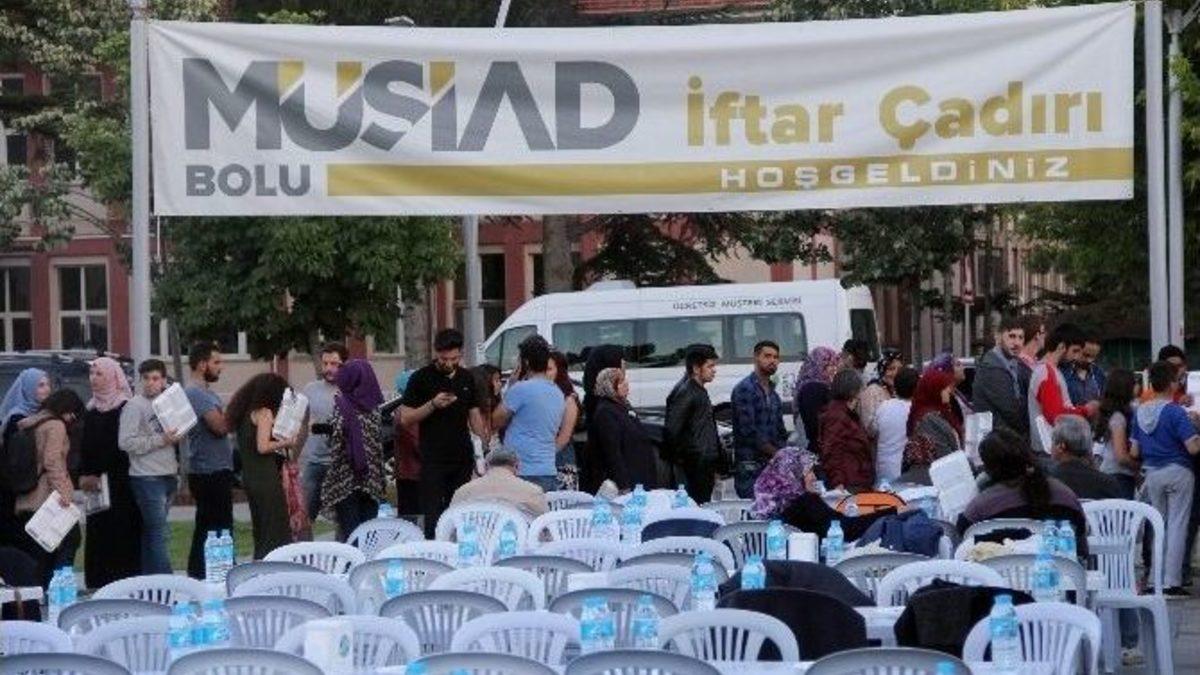 Müstakil Sanayici ve İşadamları Derneği (MÜSİAD) Bolu Şubesi tarafından bu yıl ikincisi kurulan Ramazan çadırında günde 800 kişiye iftarda yemek veriliyor. Şube Başkanı Eyüp Uzun, “Bu sofrada fakiri, zengini, Türk’ü, Arap’ı, Laz’ı, Çerkez’i, öğrencisi bir araya gelerek kardeşlik ruhu içinde hep birlikte ellerimizi semaya huşuyla açıyoruz” dedi.Kent Meydanı’nda kurulan çadırda MÜSİAD iftar çadırında günde 800 kişiye yemek veriliyor. 4 çeşit yemeğin verildiği iftar çadırına vatandaşlar yoğun ilgi gösteriyor. MÜSİAD’a bağlı işadamlarının yanı sıra vatandaşlardan gelen yardımlarla karşılanan iftar yemeğinde 7’den 70’e herkes sıraya girerek uzun kuyruklar oluşturuyor.MÜSİAD Bolu Şube Başkanı Eyüp Uzun, iftar çadırında her kesimden insanın gelerek kardeşlik ruhu içerisinde iftar çadırında bir araya gelindiğini ifade ederek, “Burada amacımız her kesimden insanı bir araya getirmek. İhtiyaç sahibi olsun olmasın fakiri, zengini, Türk’ü, Arap’ı, Laz’ı Çerkez’i, öğrencisi bir araya gelerek kardeşlik ruhu içinde hep birlikte ellerimizi semaya huşuyla açıyoruz. İftar çadırımıza protokol üyeleri de gelseler sıraya girerek vatandaşlarımızla yemeklerini alarak oruçlarını açıyorlar. Burada kimsenin bir ayrımı yok. Kardeşlik soframıza herkesi bekliyoruz” diye konuştu.