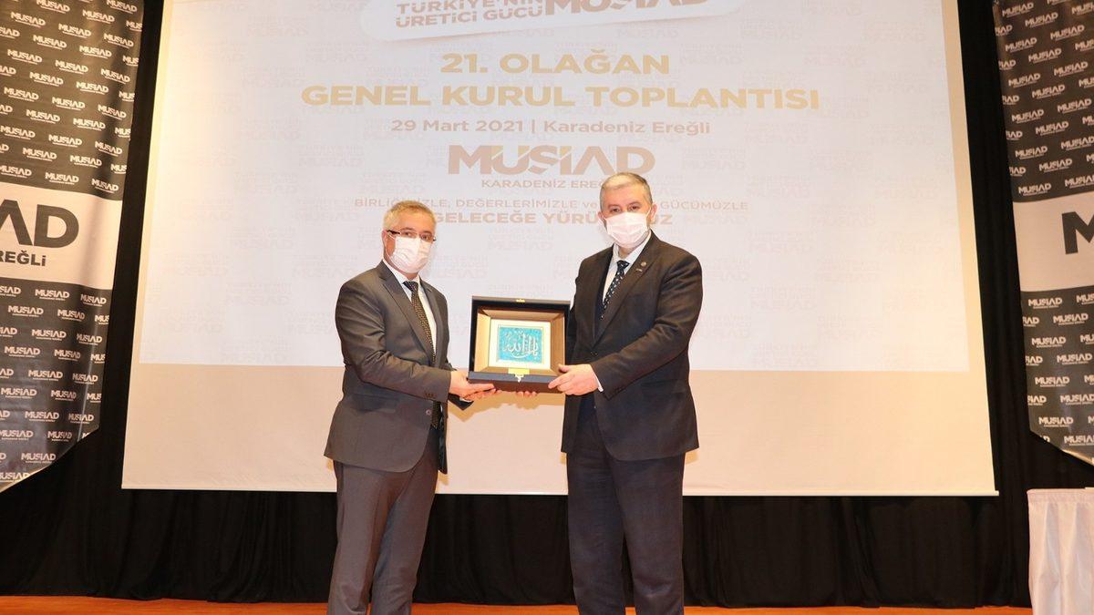 MÜSİAD Kdz. Ereğli 21. Olağan Genel Kurulu, Hüseyin Tatoğlu Kültür Merkezi’nde yapıldı. Kongreye, Zonguldak Valisi Mustafa Tutulmaz, Kdz. Ereğli Kaymakamı İsmail Çorumluoğlu, Kdz. Ereğli Belediye Başkanı Halil Posbıyık, MÜSİAD Kdz. Ereğli Başkanı Abdulkadir Çınar, Kdz. Ereğli TSO Başkanı Arslan Keleş, AK Parti Kdz. Ereğli İlçe Teşkilatı Başkanı Saffet Bozkurt, siyasi parti temsilcileri, sivil toplum kuruluşlarının temsilcileri, bölgedeki sanayici ve işadamları, MÜSİAD üyeleri ve davetliler katıldı.