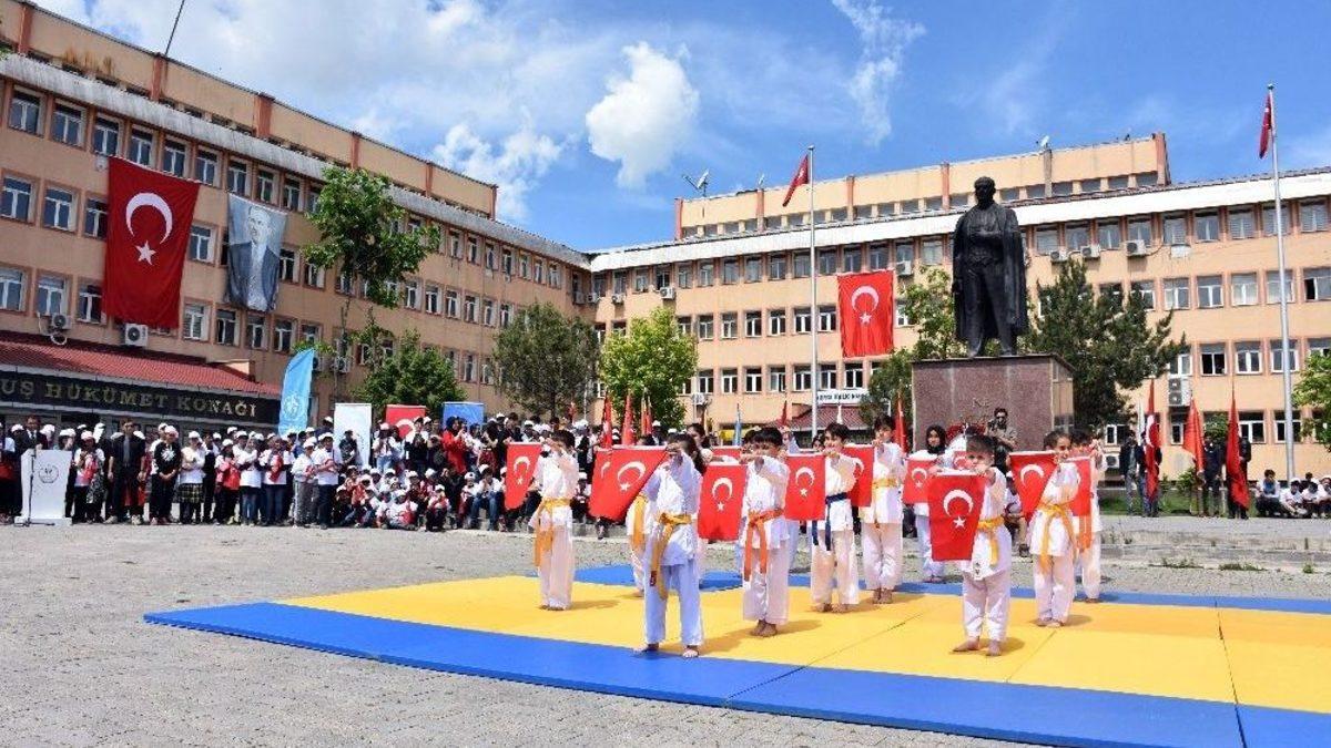 Muş’ta, 19 Mayıs Atatürk’ü Anma, Gençlik ve Spor Bayramı düzenlenen törenle coşkuyla kutlandı.19 Mayıs Atatürk’ü Anma, Gençlik ve Spor Bayramı, Türkiye genelinde olduğu gibi Muş’ta düzenlenen etkinliklerle kutlandı. 19 Mayıs Atatürk’ü Anma, Gençlik ve Spor Bayramı kutlamaları kapsamında hükümet konağı önünde bulunan Atatürk büstüne çelenk koyma programı düzenlendi. Sonrasında Muş Gençlik Hizmetleri ve Spor İl Müdürlüğü önünde toplanan sporcu ile antrenörler, İstasyon Caddesi üzerinden Muş Valiliği’ne kadar yürüyüş yaptı.Burada saygı duruşunda bulunulması ve İstiklal Marşı’nın okunmasıyla başlayan törene; Muş Valisi Aziz Yıldırım, Belediye Başkanı Feyat Asya, Cumhuriyet Başsavcısı Ömer Mete, Gençlik Hizmetleri ve Spor İl Müdür Vekili Emirhan Karakaya, Muş Gençlik Merkezi Müdürü Murat Karataş, kamu kurum amirleri, öğretmen ve öğrencilerin yanı sıra vatandaşlar katıldı.Düzenlenen kutlama programında günün anlam ve önemini belirten konuşmayı yapan Muş Gençlik Hizmetleri ve Spor İl Müdür Vekili Emirhan Karakaya, “Bugün Cumhuriyetimizin kurucusu Gazi Mustafa Kemal Atatürk’ün Samsun’a çıkışının 99. yıldönümünü kutluyoruz. Geleceğimizin teminatı olarak gördüğümüz özgüveni yüksek, milli şuur ve karakter sahibi gençlerimizin 19 Mayıs ruhunu anlamalarına, özümsemelerine ve bu ruha sahip çıkarak vatanını, bayrağını temsil etmelerine büyük önem veriyoruz. Türkiye Cumhuriyeti Devletinin ilelebet payidar kalması için ülke nüfusunun yaklaşık yüzde 17’sini oluşturan biz gençler, üstümüze düşen görev ve sorumluluğun bilincindeyiz. Bizler ülkemizin gerek içinde gerekse dışında tehdit amaçlı oluşabilecek her türlü teröre, şiddete ve kör ideolojilere hiçbir surette prim vermeyeceğiz. Bu günü vesile kılarak başta Gazı Mustafa Kemal Atatürk olmak üzere, Aziz Şehitlerimizi rahmet ve minnetle yad eder, 19 Mayıs Atatürk’ü Anma, Gençlik ve Spor Bayramınızı tebrik ederim” dedi.Karakaya’nın konuşmasının ardından milli sporcunun Muş Valisi Aziz Yıldırım’a ay yıldızlı bayrak vermesinin ardından tekvando ve eskrim gibi çeşitli spor branşında gösteriler yapıldı. Gösteriler sonrasında program, stantların gezilmesiyle sona erdi.