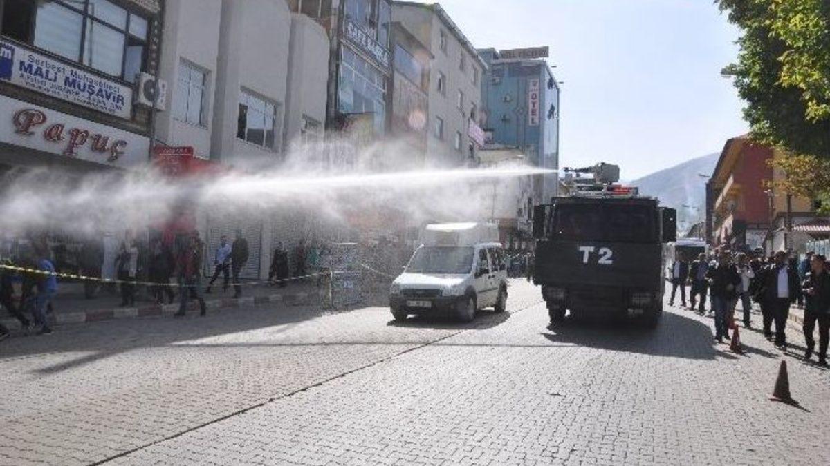 Kamu Emekçileri Sendikaları Konfederasyonu (KESK) Muş Şubeler Platformu’nun Ankara’daki barış mitingi öncesi meydana gelen patlamaya tepki göstermek amacıyla düzenlediği basın açıklamasında gergin anlar yaşandı. Basın açıklamasından sonra İstasyon Caddesi’nde slogan atan gruba polis müdahale etti.Eski Muş Kadın Doğum ve Çocuk Hastalıkları Hastanesi önünde toplanan KESK üyeleri, HDP Muş milletvekilleri Ahmet Yıldırım ve Burcu Çelik Özkan ile çok sayıda kişinin katılımıyla Belediye Meydanı’na kadar yürüyüş yaptı. Burada Eğitim-Sen Dönem Sözcüsü Derya Yolcu’nun basın açıklamasını okuması esnasında sloganların atılması tansiyonu yükseltti.Açıklama esnasında sloganların atılmasına ‘dağılın’ uyarısında bulunan polisin üzerine yürüyen HDP Muş Milletvekili Ahmet Yıldırım ve Burcu Çelik Özkan, tepki gösterdi. Polis müdürü ve HDP’li milletvekillerin tartışmasına partililer de katılınca kısa süreli gerginlik yaşandı. Gerginliğin yatıştırılmasının ardından basın açıklaması sona erdi.HDP seçim aracından yapılan uyarılara rağmen İstasyon Caddesi üzerindeki polisevi mevkiinde bir grubun slogan atarak taşkınlık çıkarması üzerine polis müdahale etti. Polisin TOMA ile yaptığı müdahalede, grup ara sokaklara kaçtı. Olaylar esnasında birçok esnafın iş yeri camı kırılırken bazı araçlar ise hasar gördü.Olaylar esnasında iş yerinin camları kırılarak zarar gören esnaflardan İbrahim Ergün, duruma tepki gösterdi. Ergün, “Basın açıklaması sonrasında esnafın camlarının kırılması, barış süresi, barış diye yapılan miting böyle olur mu? Böyle esnafın camına zarar verilir mi? Miting yapıyorsan demokrat bir şekilde, herkese özgürlük verilmiş bu devlet. Hiç kimse böyle olmasını ister mi? Benim ve yan tarafımdaki komşularımın camlarını kırmaya ne hakları var bunların? Biz de esnafız, biz de doğuluyuz ve Kürtüz. Kürtlükle, barışla bunun böyle olmasının ne alakası var. Barışsa, düzgün dürüst yürüyüşünü yaparsın sloganını atar çıkar gidersin. Bu kadar insanı üzmenin bir manası var mı? Yeter artık” şeklinde konuştu.