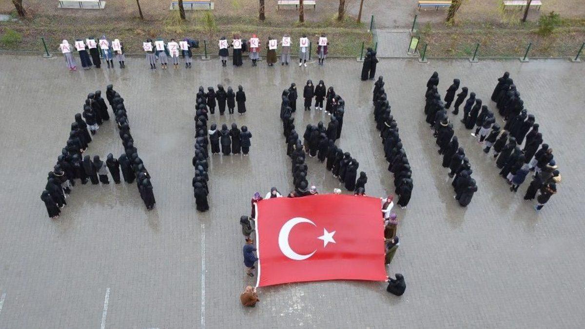 Iğdır Kız Anadolu İmam Hatip Lisesi öğretmenleri, öğrencileriyle birlikte hazırladıkları Afrin koreografisiyle Zeytin Dalı Harekatı’na destek verdi.Kız Anadolu İmam Hatip Lisesinde görevli 15 öğretmen, 150 öğrencisiyle birlikte Zeytin Dalı Harekatı’na destek vermek amacıyla okul bahçesinde bedenleriyle Afrin yazdı. Öğrenciler yağmura rağmen okul bahçesinde Türk bayrağı açarak, harekatta görevli Mehmetçiğe moral ve destek oldu.Kız Anadolu İmam Hatip Lisesi öğrencisi Dicle Caf, etkinliği yapmalarındaki amacın askerlere manevi anlamda destek vermek olduğunu söyledi. Caf, "Okul müdürü ve öğretmenlerimizin desteğiyle bu etkinliği yaptık. İnşallah askerlerimiz de bunu beğenir. Onlara destek olduğumuzu ve yanlarında olduğumuzu bildirmek için bu etkinliği yaptık. Bütün askerlerimize gerçekten çok teşekkür ediyor ve minnettarız. Allah hepsinin yar ve yardımcısı olsun" dedi.Iğdır Kız Anadolu İmam Hatip Lisesi Müdürü Ali Bekehan ise, "Türkiye geneli bütün İmam Hatip Liseleri Mehmetçik’in yanında olduğunu göstermek için bu tür faaliyetlerde bulunuyor. Biz de diğer okullar gibi Mehmetçik’in yanında olduğumuzu göstermek için bu etkinliği yaptık. İnşallah başarılı olmuşuzdur" şeklinde konuştu.Iğdır Kız Anadolu İmam Hatip Lisesi öğretmenlerinden İbrahim Güneş, bilinç oluşturmak için faaliyeti yaptıklarını belirtti. Güneş, "Türk Silahlı Kuvvetleri 53 gündür harekatta. Bu harekat sadece bir bölgeye veya bir millete ithaf edilemiyor. Bu harekat ülke, devlet ve milletimizin harekatıdır. Bu harekat bir yer almak için değil orada ki masumların kurtarılması içindir. Devletimiz Müslümanlara yardım etmek için oraya gitti. Orada kurtarılan masumlar Mehmetçik’e yakarışlarda bulunarak, Allah sizi bağışlasın ve korusun diyor. Kurtarılan bir kadın, ben 5 yıldır sizi bekliyorum diyor. Biz de öğrencilerimizde bir bilinç oluşturmak, şehitlerimizin ve bu vatanın değerini öğretebilmek için bu faaliyeti gerçekleştirdik. Öğrencilerimizle birlikte okul bahçesinde Allah sizi korusun pankartı ve Türk Bayrağımızı açtıktan sonra Mehmetçiklerimiz için harekatın olduğu yerin adını yazdık. Afrin yazmamızdaki amaç, bütün masumları kurtarmak ve Mehmetçiğimizin yanında olduğumuzu göstermek için bir mesaj yolladık. Okul yönetiminin desteğiyle Afrin şehitleri duvarı ve Mehmetçiğe mektup kutusu yaptık. İsteyen öğrenci Mehmetçiklere mektup yazacak ve biz bu mektupları Afrin’deki Mehmetçiklerimize moral olsun diye yollayacağız" ifadelerini kullandı.