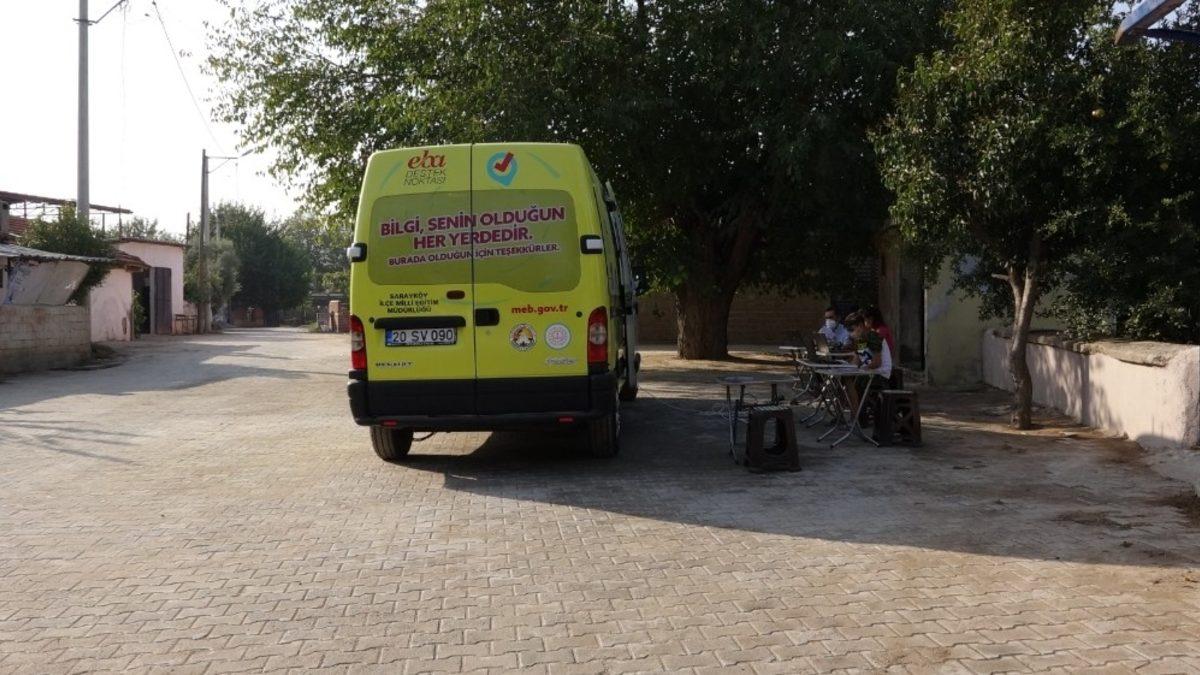 Sarayköy Belediyesi ve İlçe Milli Eğitim Müdürlüğü işbirliği ile ilçenin uzak mahallelerinde internete erişim ve araç gereç konularında sıkıntı yaşayan öğrencilerin eğitimden mahrum kalmaması için faaliyete geçirilen EBA Mobil Destek Aracı, öğrencilere hizmet vermeye başladı. Her gün öğrencilerin ders saatlerinde eğitimlerine katılmalarında aksama olmadan faaliyetine devam ettirilen EBA Mobil Destek Aracı’nın kurulacağı alan için Sarayköy Belediyesi özel çalışma başlattı. EBA Mobil Destek Aracı’nın ders sırasında öğrencilerin dikkatini bozabilecek çöp, toz, moloz atığı ve kötü görünüm oluşturan otları temizleme çalışması başlatıldı. Alan tam anlamıyla temizlendikten sonra EBA Mobil Destek Aracı öğrencilerinin uzaktan eğitim alması için öğretmenler tarafından kuruluyor.