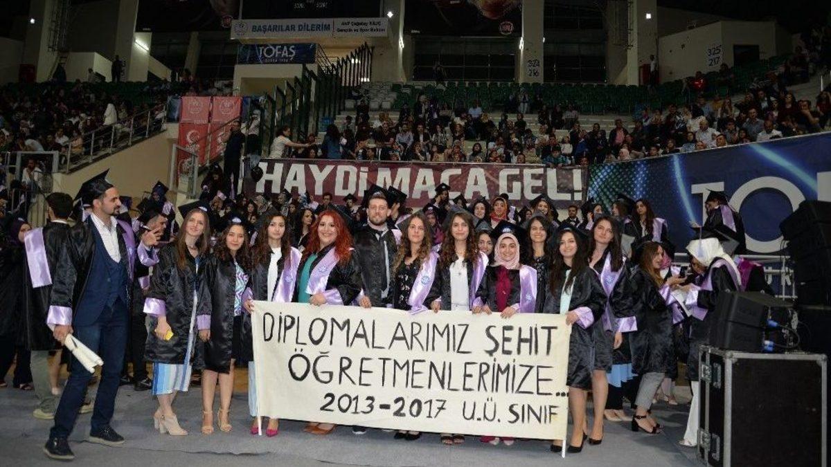 Uludağ Üniversitesi (UÜ) Eğitim Fakültesi’nden mezun olan öğretmen adayları, aldıkları diplomaları görevleri başında şehit olan meslektaşlarına adadı.UÜ Eğitim Fakültesi 2016-2017 Eğitim Öğretim Sezonu Diploma Töreni, Tofaş Kapalı Spor Salonu’nda gerçekleştirildi. Törene Bursa Büyükşehir Belediye Başkan Vekili Abdülkadir Karlık, UÜ Rektör Yardımcısı Prof. Dr. Tevfik Yücedoğru, Eğitim Fakültesi Dekanı Prof. Dr. Muammer Demirel, bölüm başkanları, akademisyenler, öğrenciler ve aileleri katıldı.Karlık: "Sorumluluk sırası sizde"Büyükşehir Belediye Başkan Vekili Abdülkadir Karlık törende yaptığı konuşmasında mezun olan öğrencilere yeni hayatlarında başarılar diledi. Kur-an’ı Kerim’de indirilen ilk ayetin ‘oku’ ile başladığına işaret eden Başkan Vekili Abdülkadir Karlık, “İlim her şeyin temelini oluşturuyor. Cumhuriyetimizin kurucusu Mustafa Kemal Atatürk ’hayatta en hakiki mürşit ilimdir’ diyerek eğitimin önemine işaret etmiştir. Yunus Emre ne güzel söylemiştir; ilim ilim bilmektir, ilim kendin bilmektir. Bizim kültürümüzde de ilim almanın önemi büyüktür. Sizler de burada 4 yıl boyunca en güzel şekilde eğitimlerinizi aldınız. Bundan sonra bu sorumluluk ve duygularla geleceğimizin teminatı olan yeni nesillerimizi yetiştirmek göreviniz olacak. Artık sorumluluk ve inisiyatif sizlerde olacak. Yeni hayatlarınızda ve yeni görevlerinizde hepinize başarılar diliyorum” dedi.Yücedoğru: "Gittiğiniz yerlerde en iyi şekilde temsil edin"Törende öğrencilere seslenen UÜ Rektör Yardımcısı Prof. Dr. Tevfik Yücedoğru ise Uludağ Üniversitesi Eğitim Fakültesi’nden mezun olmanın öğrencilere ilerleyen dönemlerde her zaman avantaj sağlayacağına inandığını söyledi. Eğitimin erdemli bir davranış olduğuna işaret eden Rektör Yardımcısı Yücedoğru, “Erdem hiçbir maddi karşılık beklemeden yapılan davranışlardır. Erdemli davranışların bedeli yoktur. Satın alınamaz ve kimseye satılamaz. Samimiyet ve ihlasla yapıldığı zaman çok değerli olur. Bu davranışların bedelini sizlere bu millet ödüyor ve ödeyecektir. Dolayısıyla bu yetişmiş insan gücünü Anadolu’nun her tarafından samimiyetle sergilemek bundan sonra sizin görevinizdir. Ülkemizin her tarafında memleketimize hizmet etmek bir ibadettir. Devletimizin verdiği maaşla en güzel şekilde öğrenciler yetiştirmek sizin görevinizdir. İşte o görevin 4 yıl boyunca nasıl yapılacağını öğrendiniz. Bundan sonra da gittiğiniz her yerde üniversitemizi en iyi şekilde temsil etmenizi diliyorum. Yolunuz açık olsun” diye konuştu.Konuşmaların ardından Müzik Öğretmenliği Anabilim Dalı öğrencileri şehit öğretmenler için hazırladıkları eserlerden oluşan mini bir konser verdi. Öğrenciler de açtıkları pankartlar ile aldıkları diplomaları şehit öğretmenlere adadı. Törenin sonunda tüm öğrenciler hep birlikte diplomalarına kavuşmanın sevincini yaşadı.