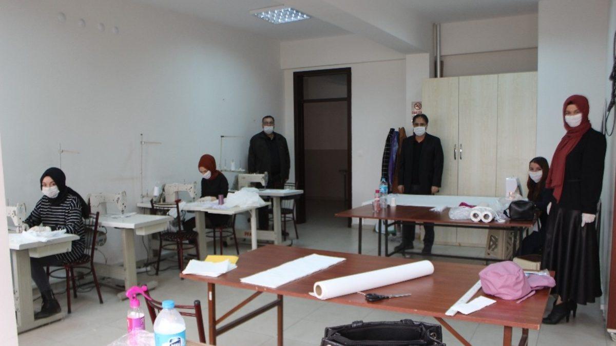 İlçedeki Nilüfer Hatun Mesleki ve Teknik Anadolu Lisesinin gönüllü öğretmenleri ile Halk Eğitim Merkezinde giyim kursuna katılan gönüllü kursiyerler, usta öğreticileri ile birlikte yeni tip Korona virüs (Covid-19) tedbirleri kapsamında günlük 2 bin maske, 60 adet bone ve 60 adet 3D yazıcı ile ’’Yüz koruyucu Siperlik Maske’’ üretmeye başladı.
